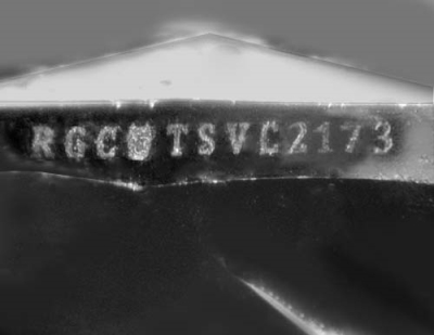 This image is an actual photograph of the laser inscription on this particular gemstone. Photography is done using a microscope camera at 45 x magnification to render the image.