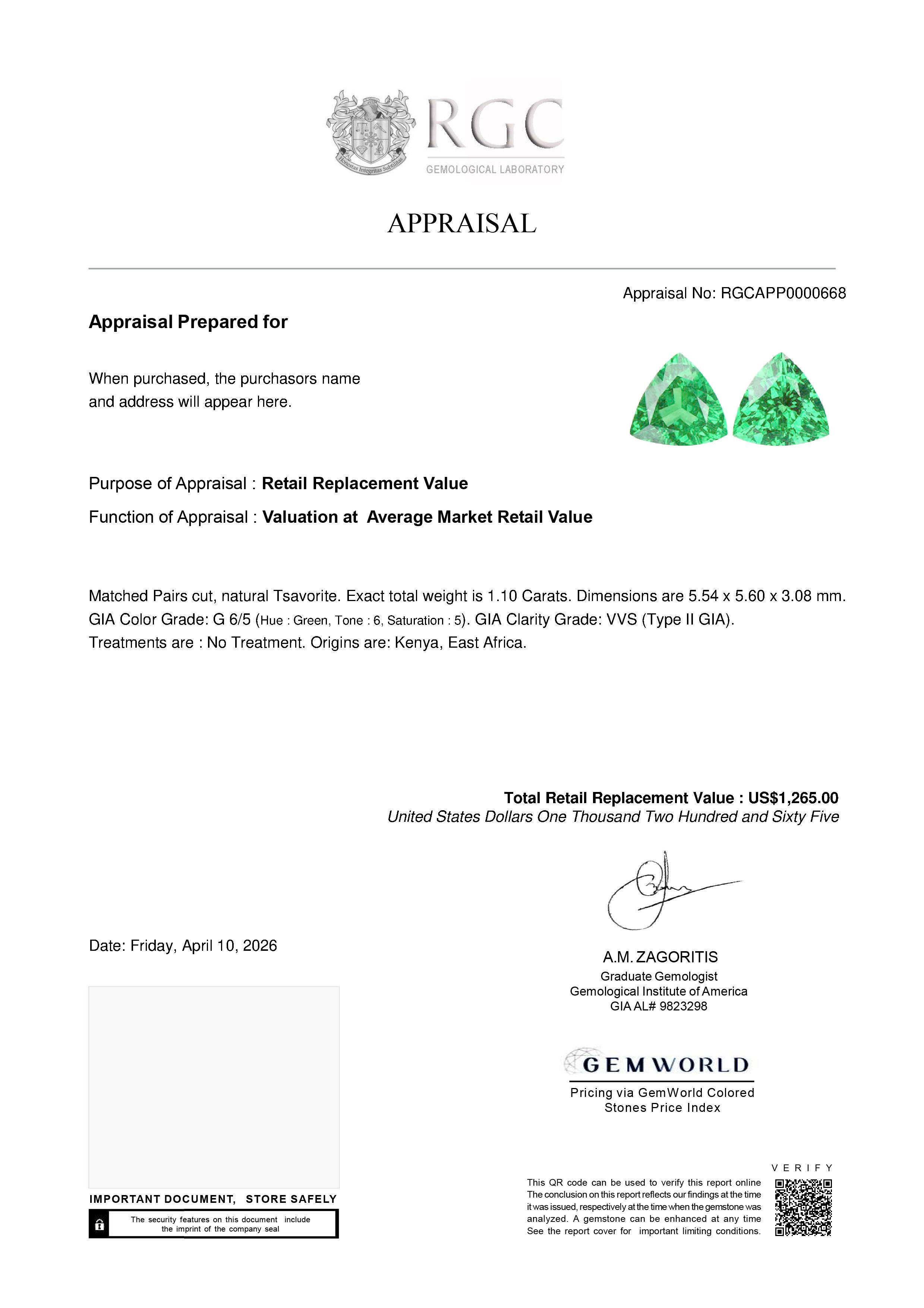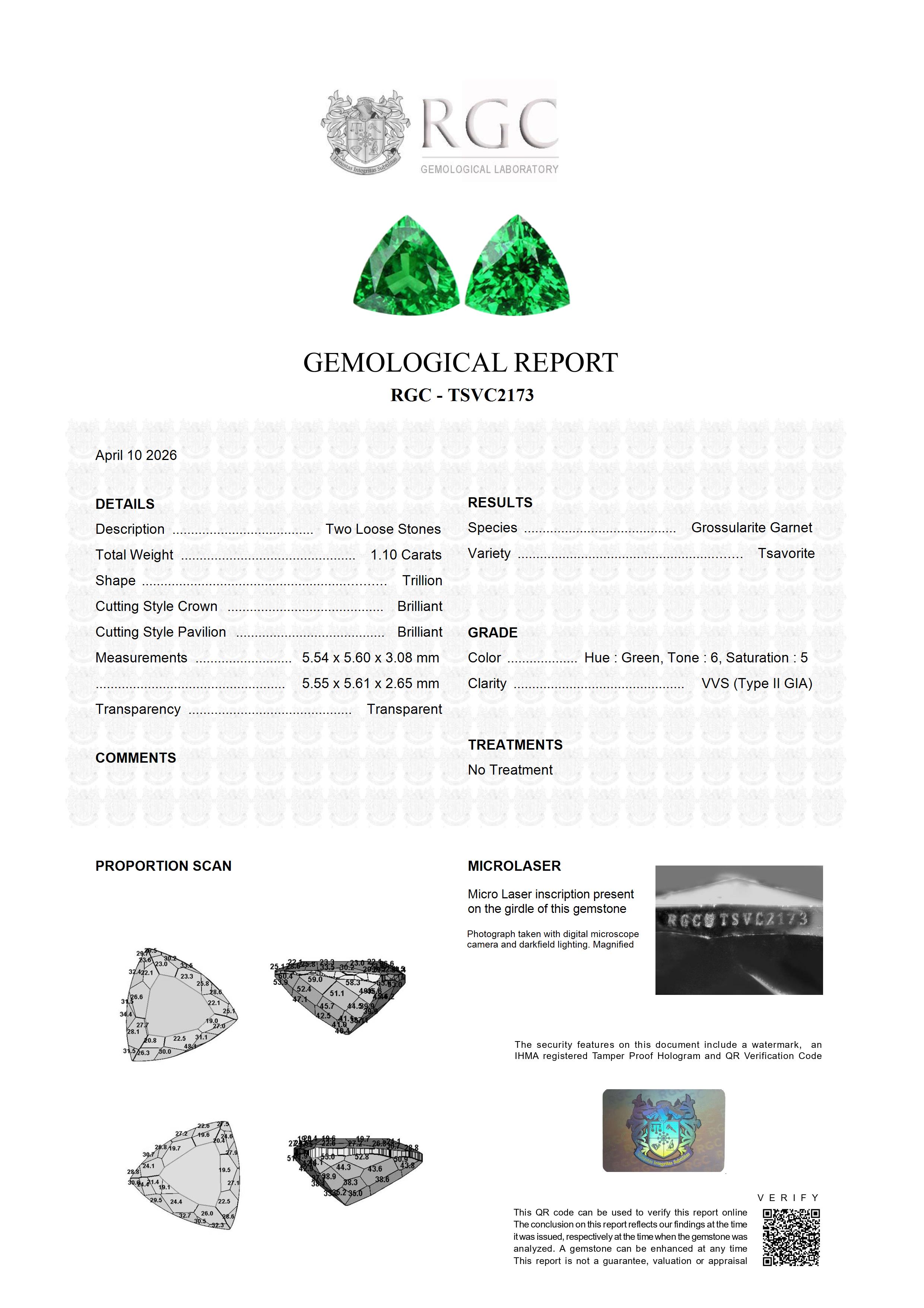 Bursting with brilliance, this little pair of trillions would make an exquisite pair of stud earrings, or perhaps sidestones in a ring with a Diamnd center stone. Exceptional Tsavorites, with a crisp, pure green color, optimal tone, top clarity and great cutting.