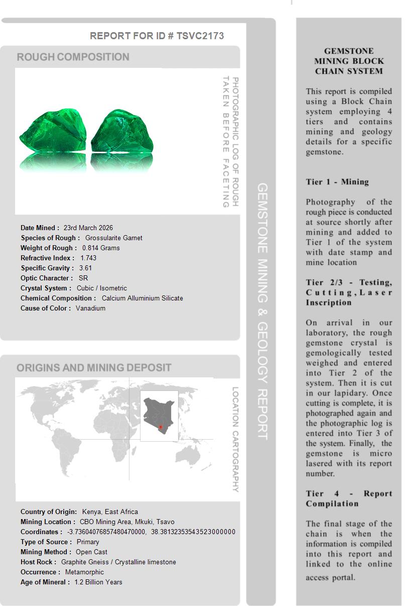 This Tsavorite is over 1.2 Billion Years old. After being removed from the vein and "knocked" to remove the host rock, this Tsavorite weighed 0.814 Grams. The photograph on the left, shows it as it looked at this stage in its journey. Tests showed it has a Specific Gravity of 3.61, an optic character of SR and it formed in the Othorhombic crystal system. Its Chemical Composition is Calcium Alluminium Silicate and its Cause of Color is Vanadium