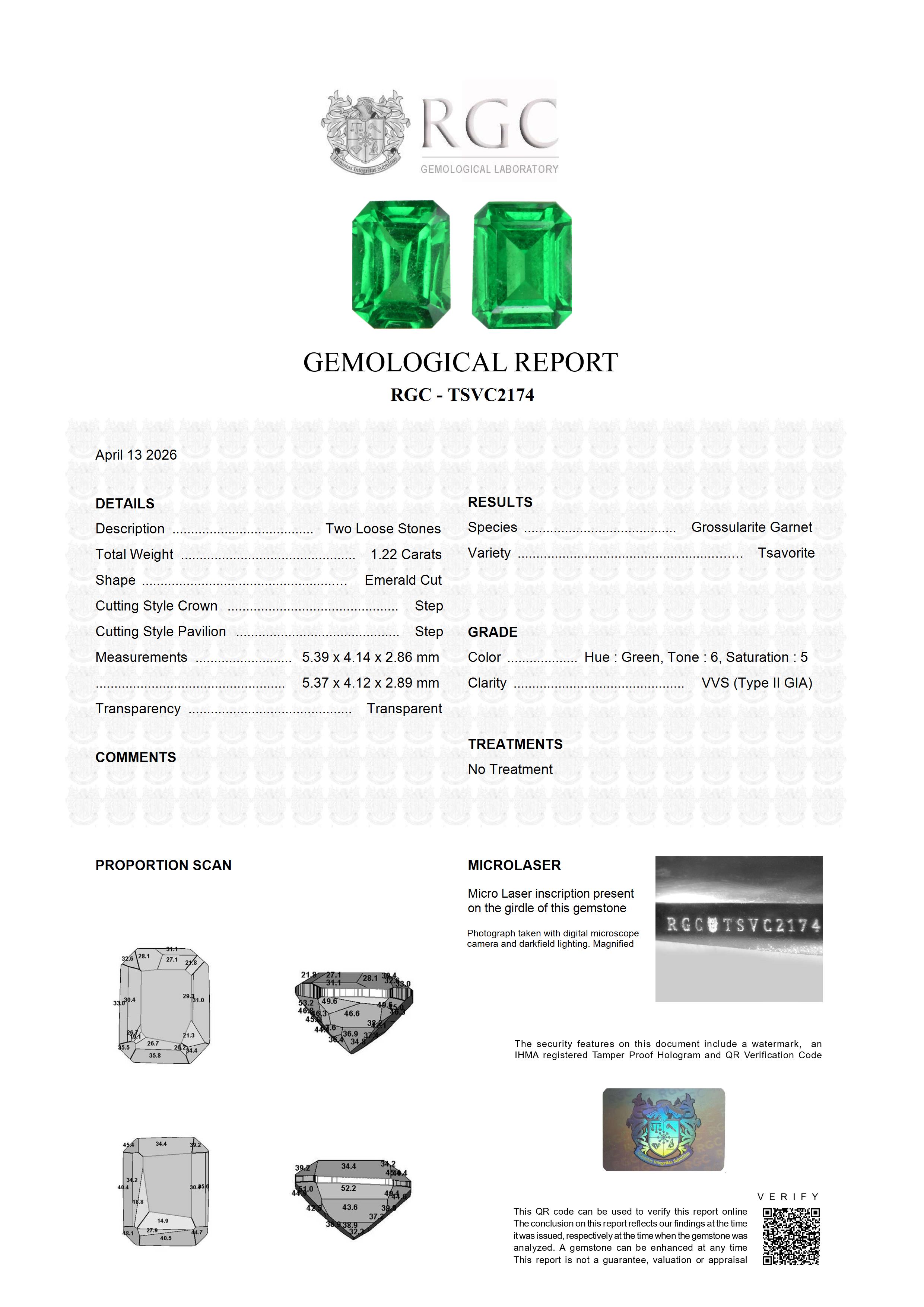 This is a stunning matched pair of exceptional Tsavorites.The color of both stones is extraordinary - a sumptuous intense vivid green which is crisp and open. No Emerald, not even the finest Muzo material could match it. Rare, beautiful and extremely fine.