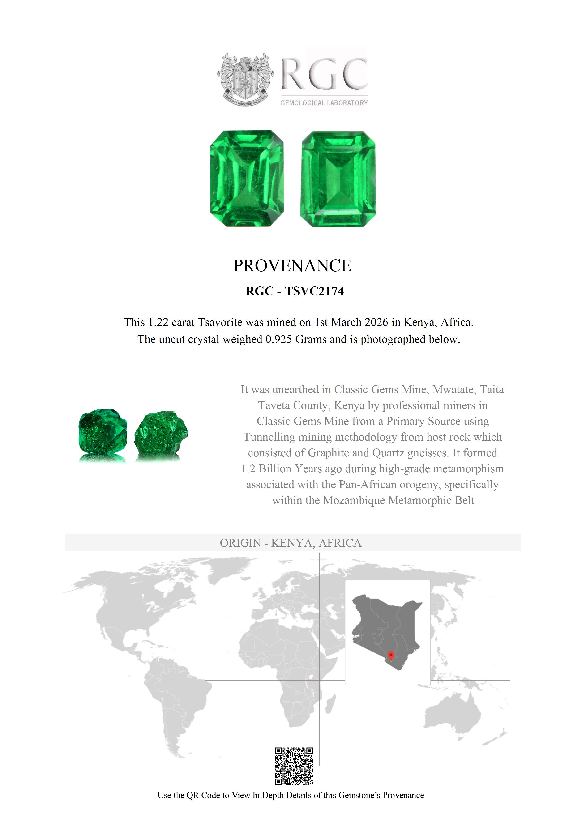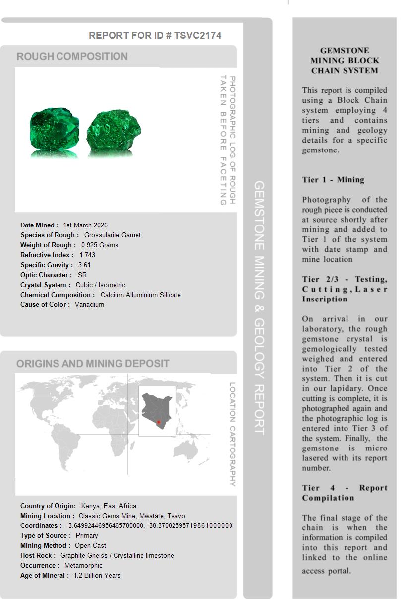 Our master cutters have over 30 years of cutting experience each and take great pride in cutting the best shape and style to capture the beauty of each piece. This wonderful Tsavorite is no exception and it was painstakingly fashioned, facet by facet into the beautiful piece you see today. This is a very special and very rare piece of nature.