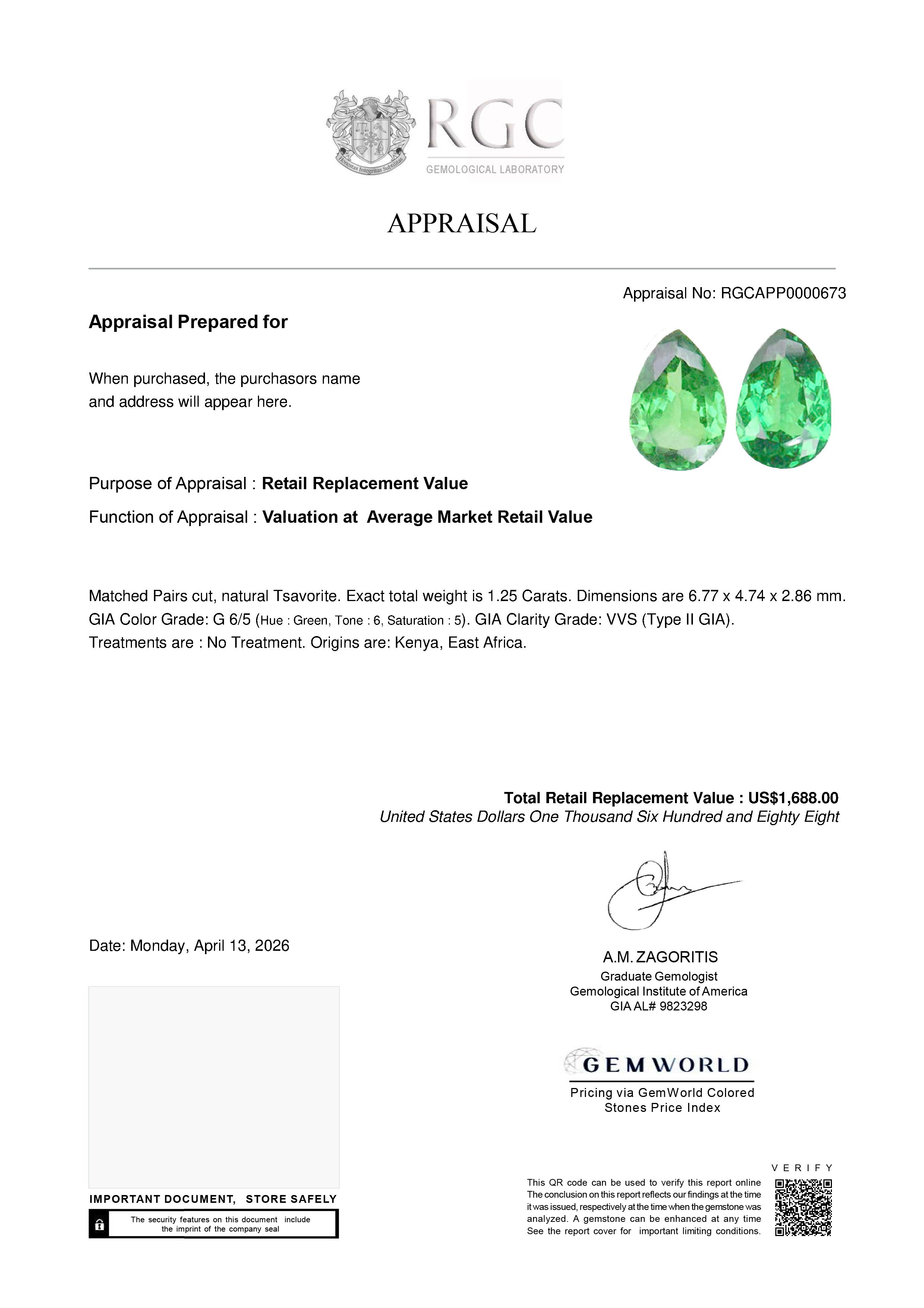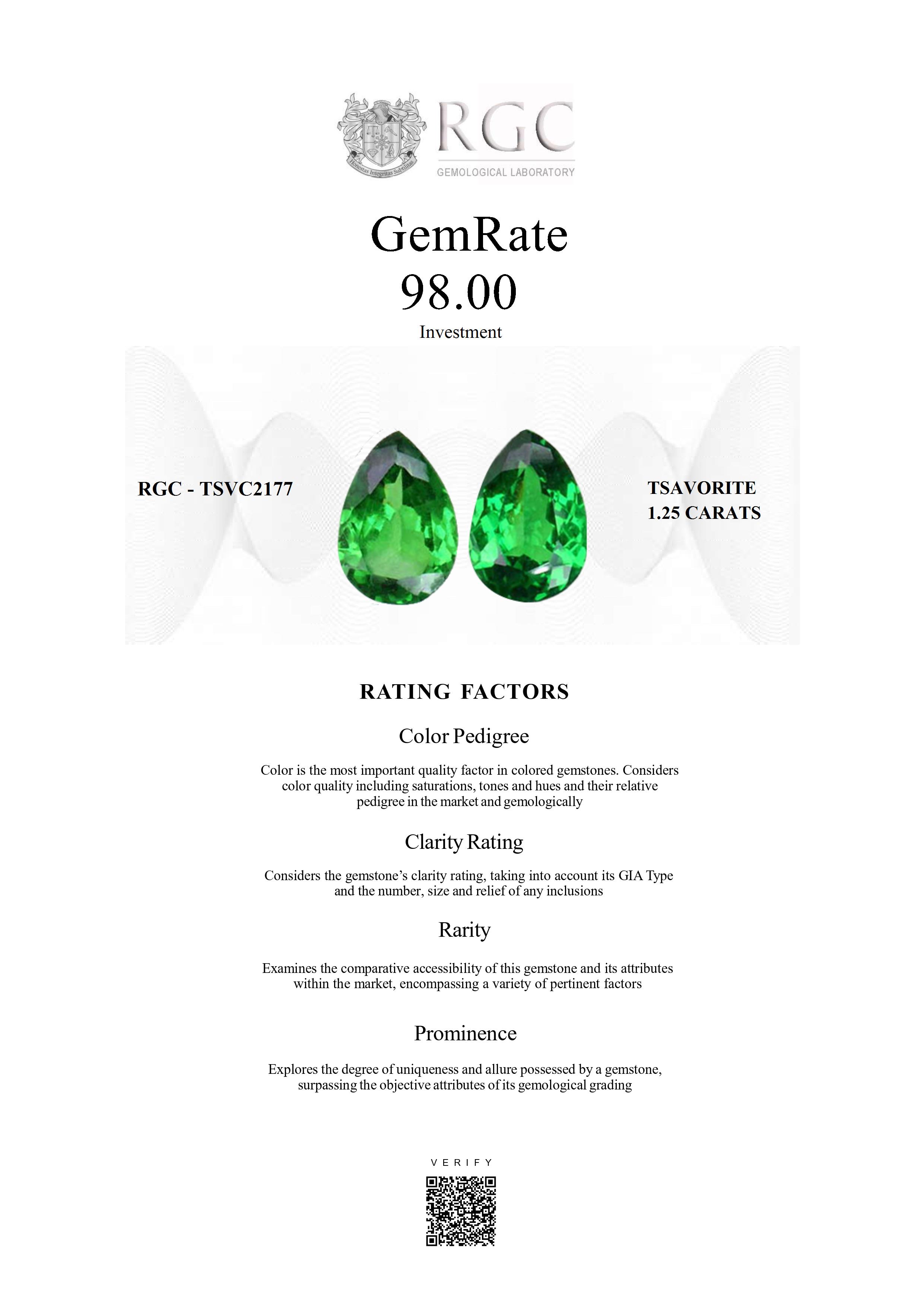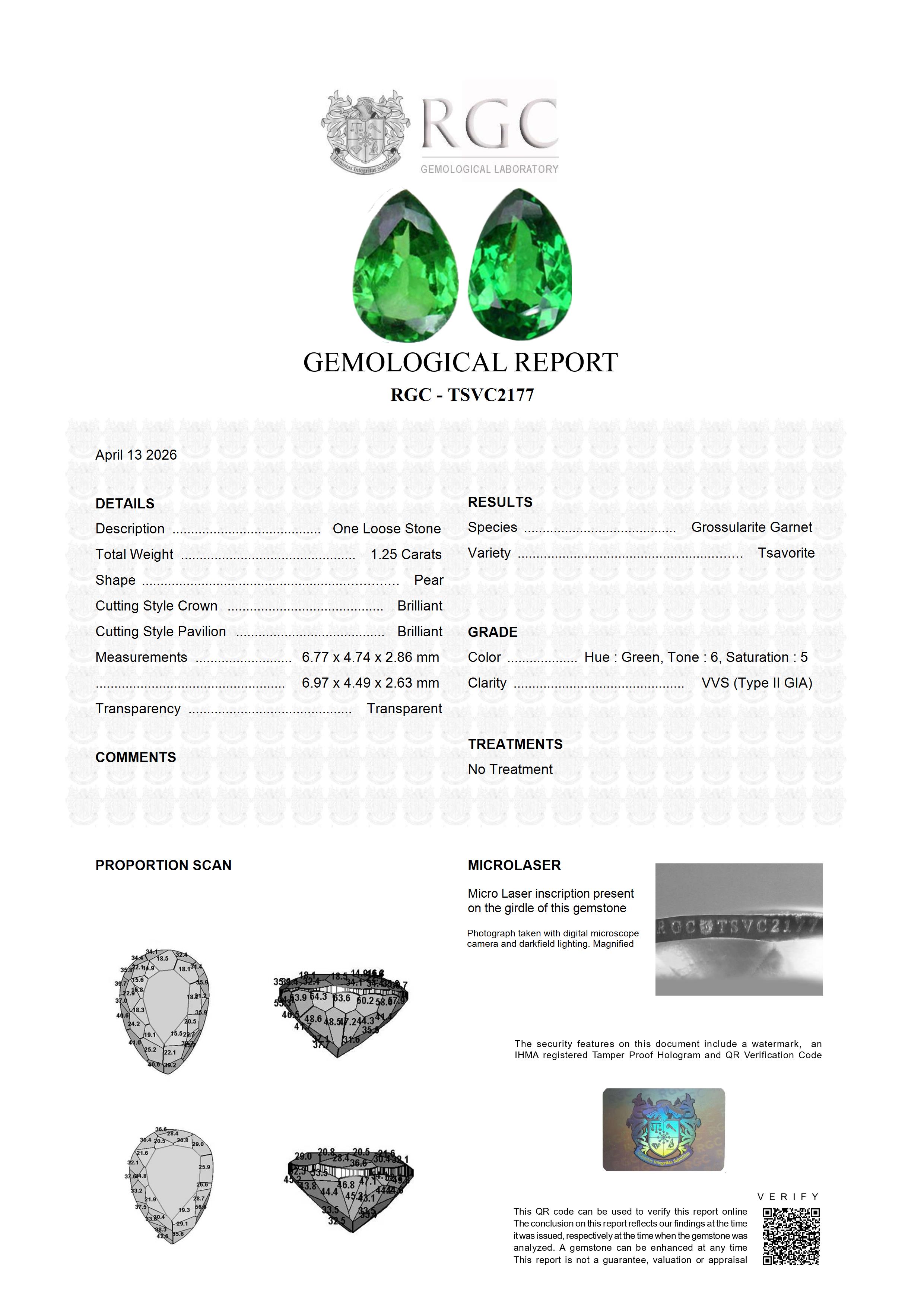 This exquisite pair of tsavorites, totaling 1.25 carats, features elegantly proportioned pear shapes that radiate both grace and vibrancy. Each gemstone exhibits exceptional brilliance, with light moving effortlessly through the stones to produce a lively sparkle and captivating scintillation. Their color is particularly striking—a fresh, vivid green with ideal tone and saturation, achieving a perfect harmony between brightness and depth.