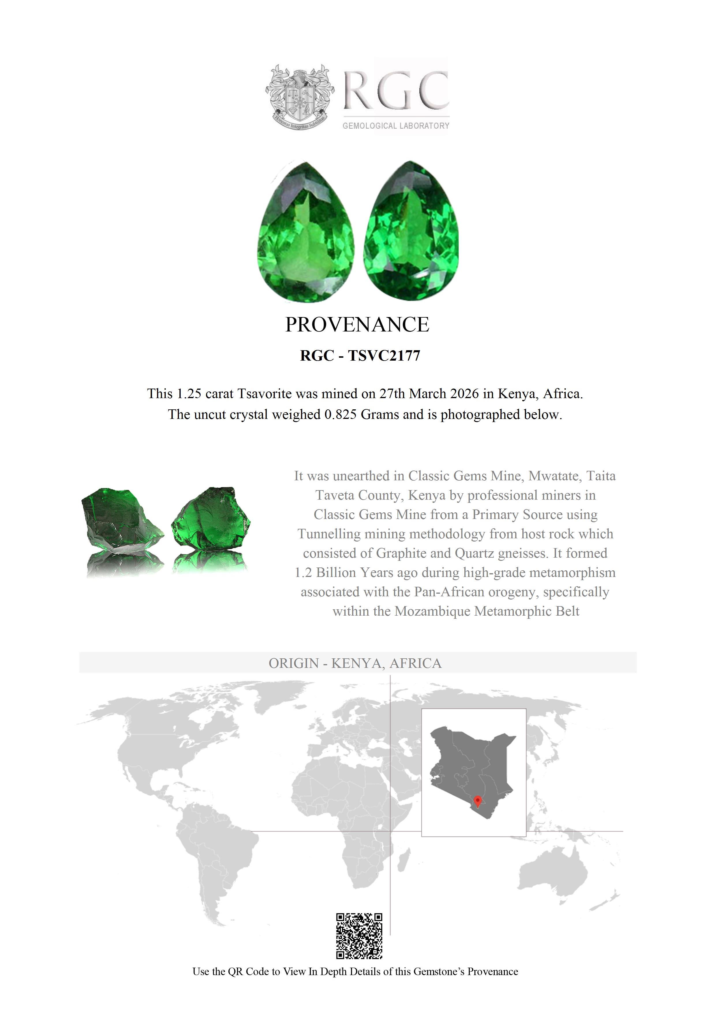 In a lion-infested, dry area of Africa, amongst the Taita Hills of Kenya lies the place where Tsavorite was discovered and first mined. The basement system of rocks within which Tsavorite forms has been dated at between 800 million years and 1.2 billion years old. Tsavorite formed sometime during this time due to a process called “metamorphism”. As magma pushed its way up through the existing rock the contact between the invading magma and the older rock caused a change to occur. The intense heat (as high as, and exceeding 750 degrees centigrade (about 1,530 degrees Fahrenheit) made the nearby minerals recrystallize into minerals stable at the higher temperature. These Tsavorites were amongst these. Millions of years later, as miners chiseled away at the mine face in the Wandani mining area they came across a “potato” or gem pocket. They chiseled it open and inside was a concentration of intense green gem quality Tsavorite. This was carefully clipped away from the host rock and collected into a “parcel” which was taken to Nairobi. Here, in the Lapigems offices they were bought and “knocked” in order to remove heavily included sections. These clean crystals were then examined and cut. This beautiful pair of Tsavorites were some of these, and what you see before you today is many hundreds of millions of years old and a true gift of nature.