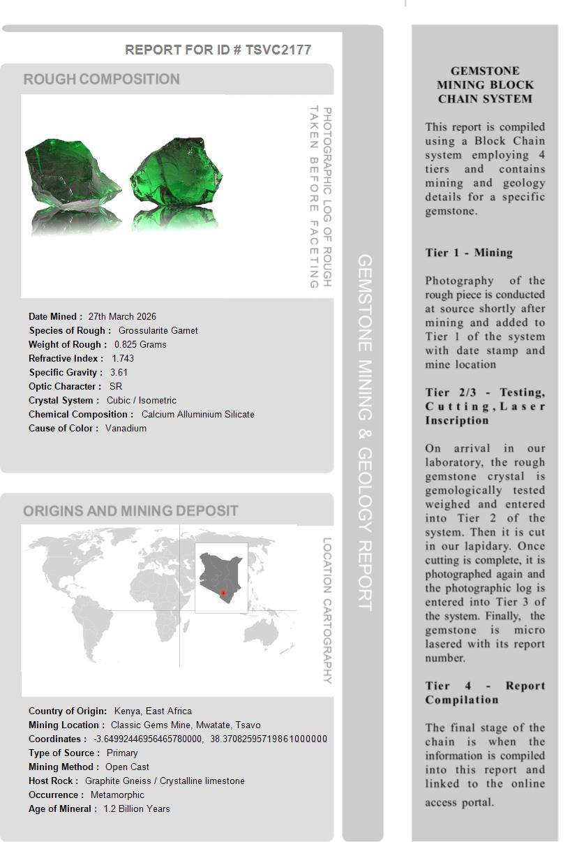 This Tsavorite is over 1.2 Billion Years old. After being removed from the vein and "knocked" to remove the host rock, this Tsavorite weighed 0.825 Grams. The photograph on the left, shows it as it looked at this stage in its journey. Tests showed it has a Specific Gravity of 3.61, an optic character of SR and it formed in the Othorhombic crystal system. Its Chemical Composition is Calcium Alluminium Silicate and its Cause of Color is Vanadium