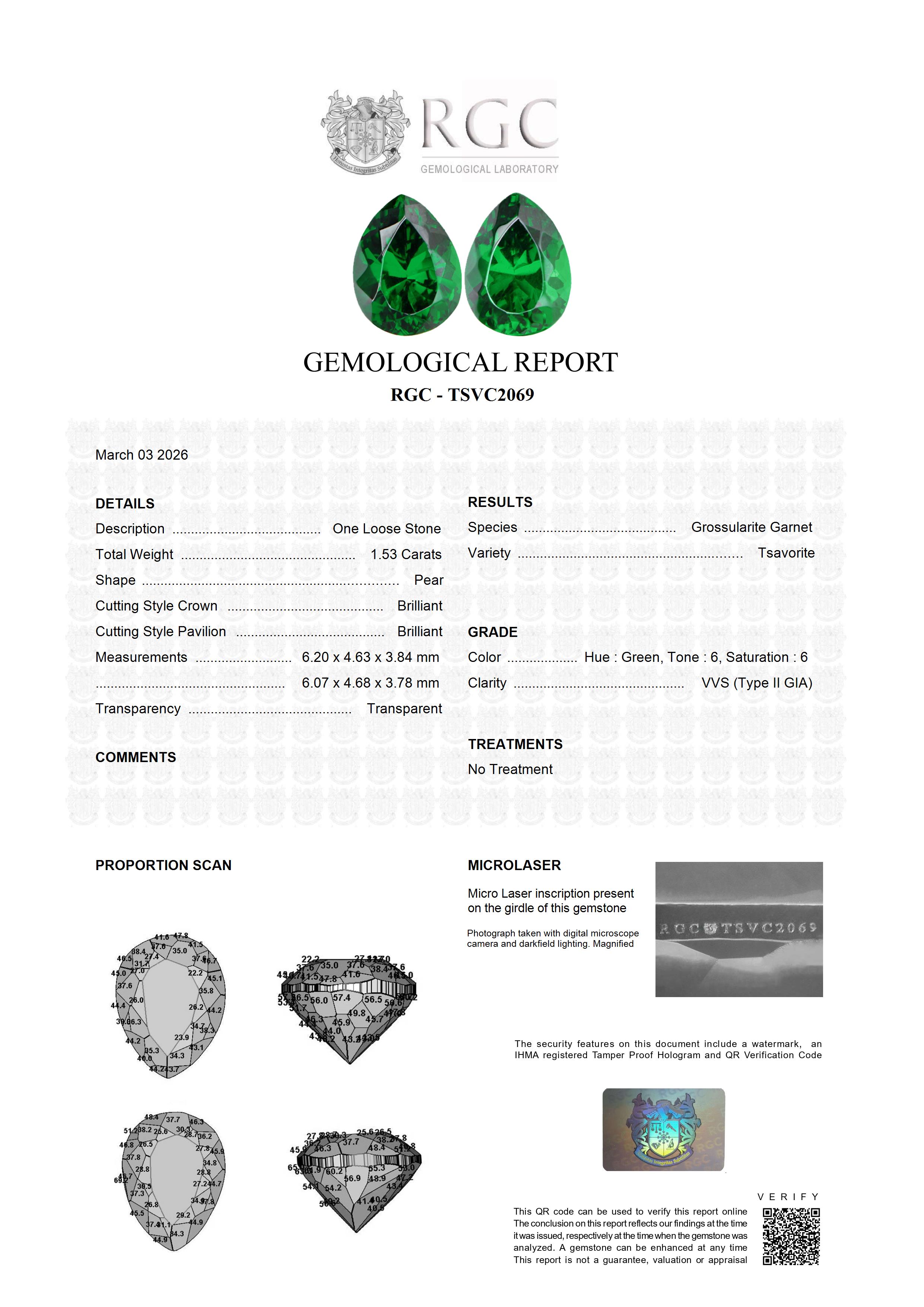 Velvety deep, pure green hues are the hallmark of this amazing pair of pears. If you have been unimpressed with the proliferation of pale yellowish green Tsavorite on the market then this pair is for you. Both stones are flawless and truly glow with an inner green fire - both stones boast a vivid, intense pure green with no yellow modifier - absolutely superb.