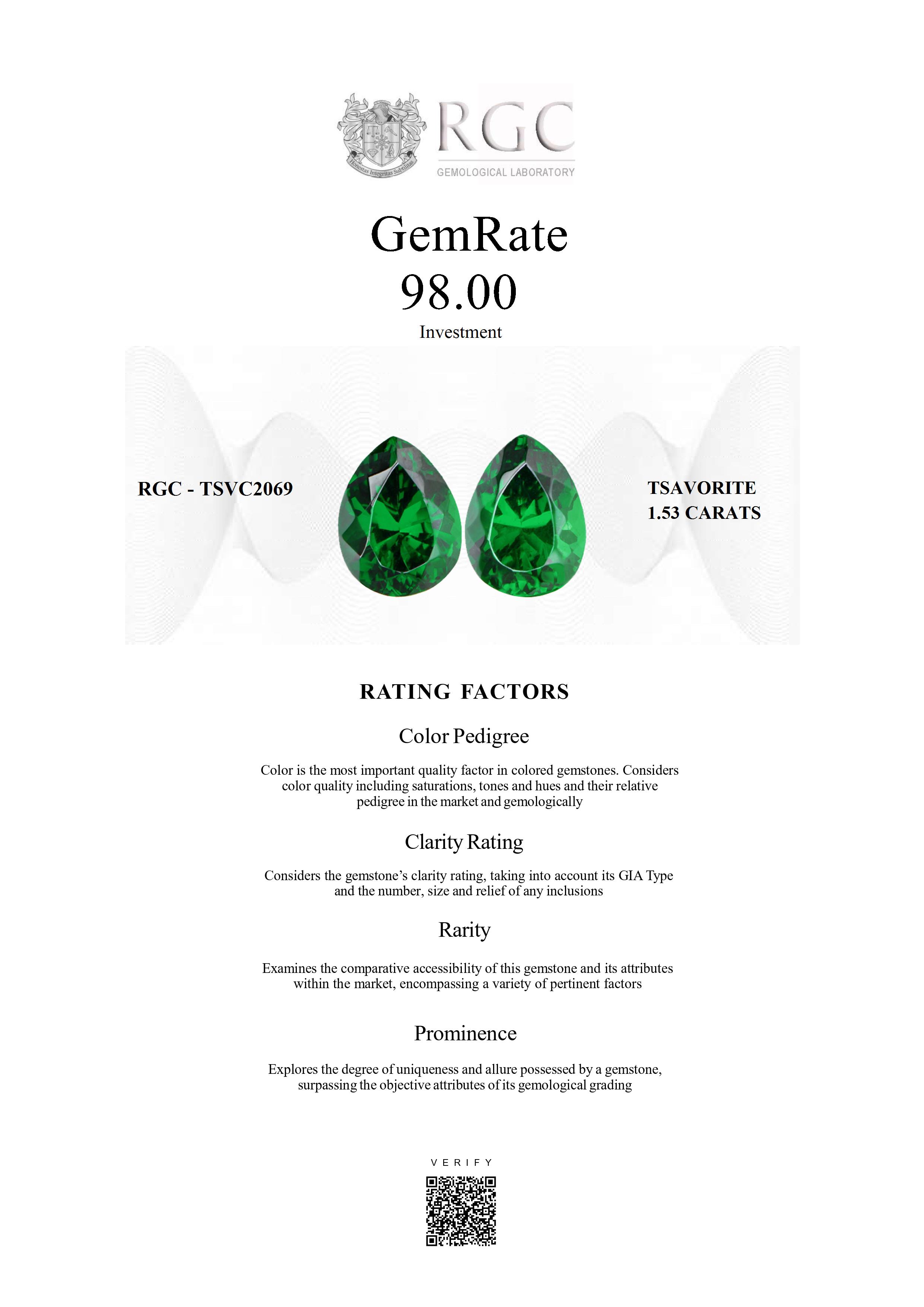 Experienced gemologists forensically examine each gemstone and apply ratings across all factors with different weightings to come up with a single number and classification thereby providing comparability by reducing the complexity inherent to colored gemstones.