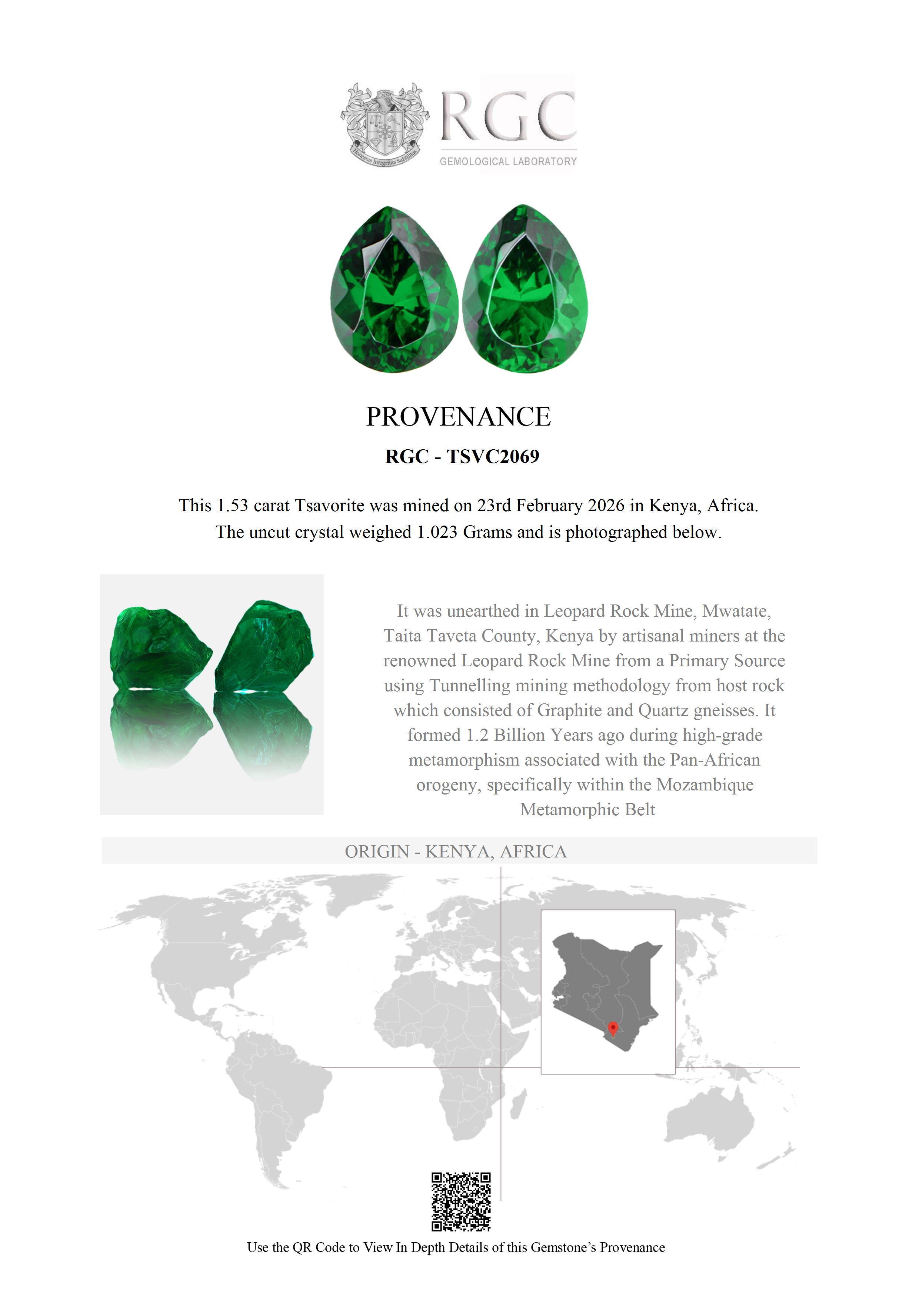 In a lion-infested, dry area of Africa, amongst the Taita Hills of Kenya lies the place where Tsavorite was discovered and first mined. The basement system of rocks within which Tsavorite forms has been dated at between 800 million years and 1.2 billion years old. Tsavorite formed sometime during this time due to a process called “metamorphism”. As magma pushed its way up through the existing rock the contact between the invading magma and the older rock caused a change to occur. The intense heat (as high as, and exceeding 750 degrees centigrade (about 1,530 degrees Fahrenheit) made the nearby minerals recrystallize into minerals stable at the higher temperature. These Tsavorites were amongst these. Millions of years later, as miners chiseled away at the mine face in the Wandani mining area they came across a “potato” or gem pocket. They chiseled it open and inside was a concentration of intense green gem quality Tsavorite. This was carefully clipped away from the host rock and collected into a “parcel” which was taken to Nairobi. Here, in the Lapigems offices they were bought and “knocked” in order to remove heavily included sections. These clean crystals were then examined and cut. This beautiful pair of Tsavorites were some of these, and what you see before you today is many hundreds of millions of years old and a true gift of nature.
