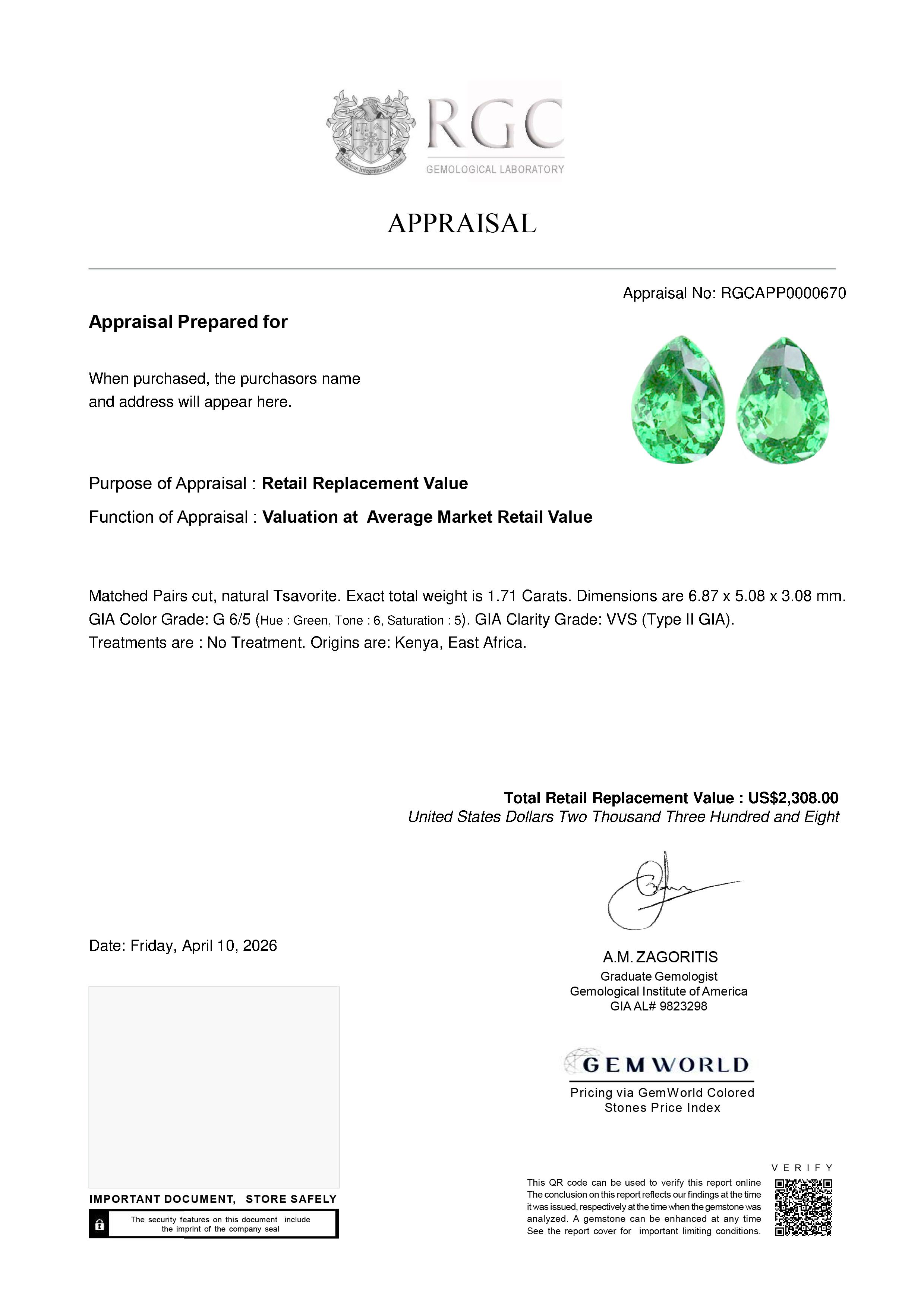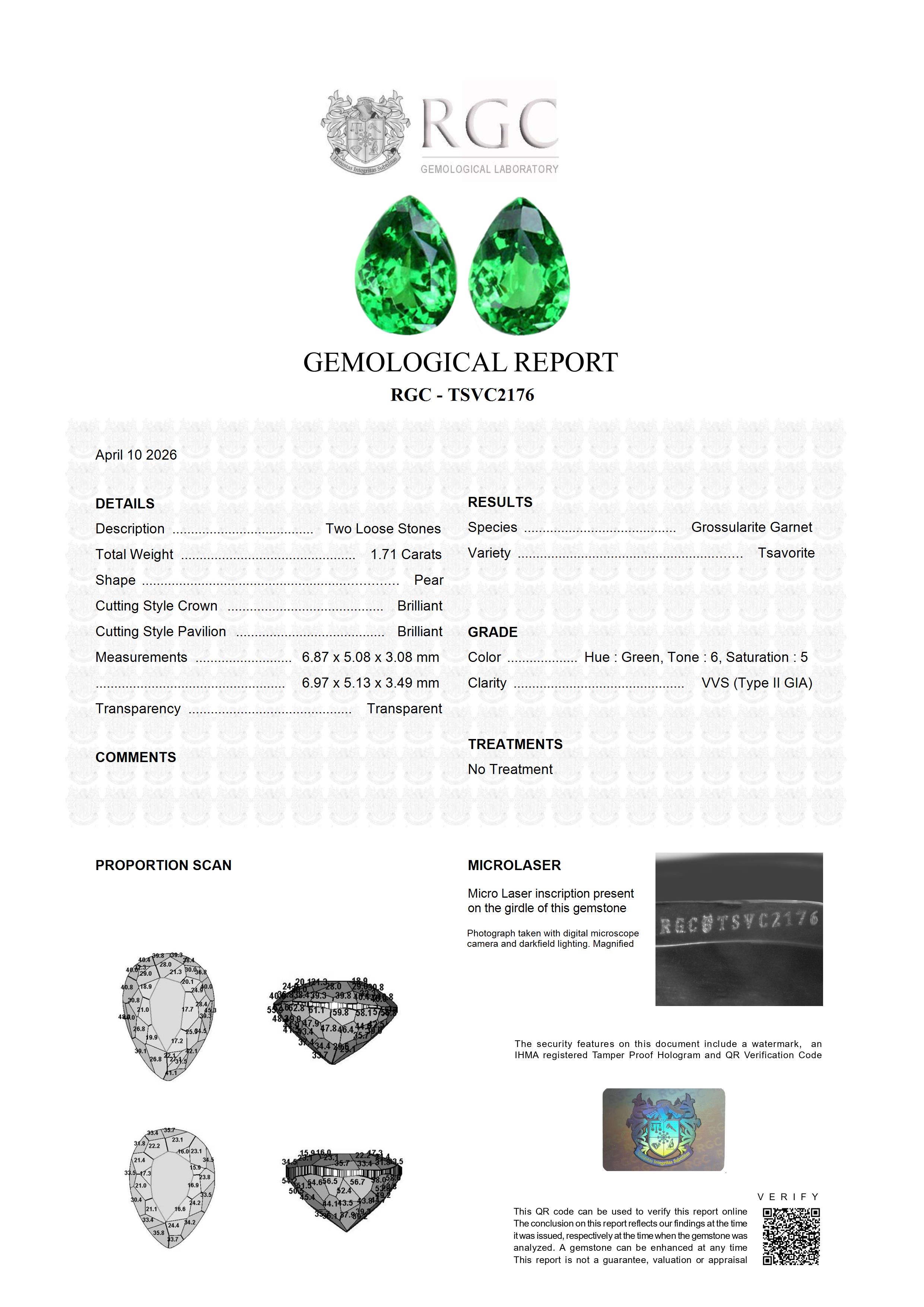This exceptional matched pair of tsavorites, with a total weight of 1.71 carats (0.86 carats each), showcases beautifully proportioned pear shapes that are both elegant and lively. Each stone displays remarkable brilliance, with light dancing effortlessly within, creating vivid sparkle and scintillation that immediately draws the eye. The color is outstanding—a crisp, open green with optimal tone and saturation—striking the perfect balance between freshness and intensity. Perfectly matched in size, shape, and hue, this pair is ideally suited for a refined set of earrings, offering both sophistication and vibrant allure.
