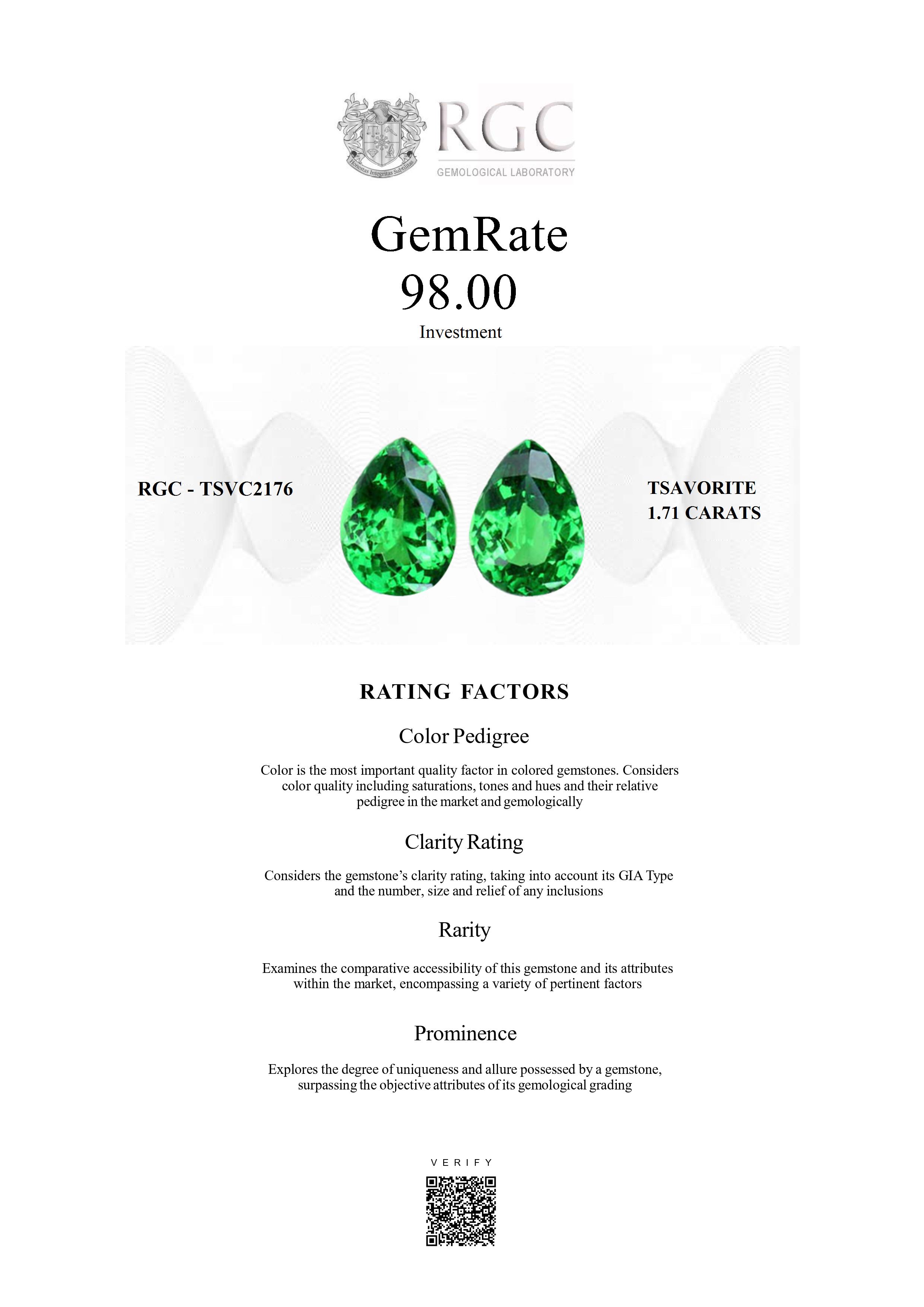 The RGC GemRate is a revolutionary system that addresses the importance and difficulty of comparing different colored gemstones with their peers in the marketplace. It assesses a wide variety of factors that exist in the marketplace and gemologically to classify gems in their genre using a standardized rating system. These factors are myriad but include quantifiable factors like color grade, clarity and cut, rarity factors examining relative rarity and also qualitative factors such as prominence, which examines the degree to which a gemstone stands out and captivates beyond just its measurable quality traits. It's essentially the stone's ability to catch attention and distinguish itself from others.