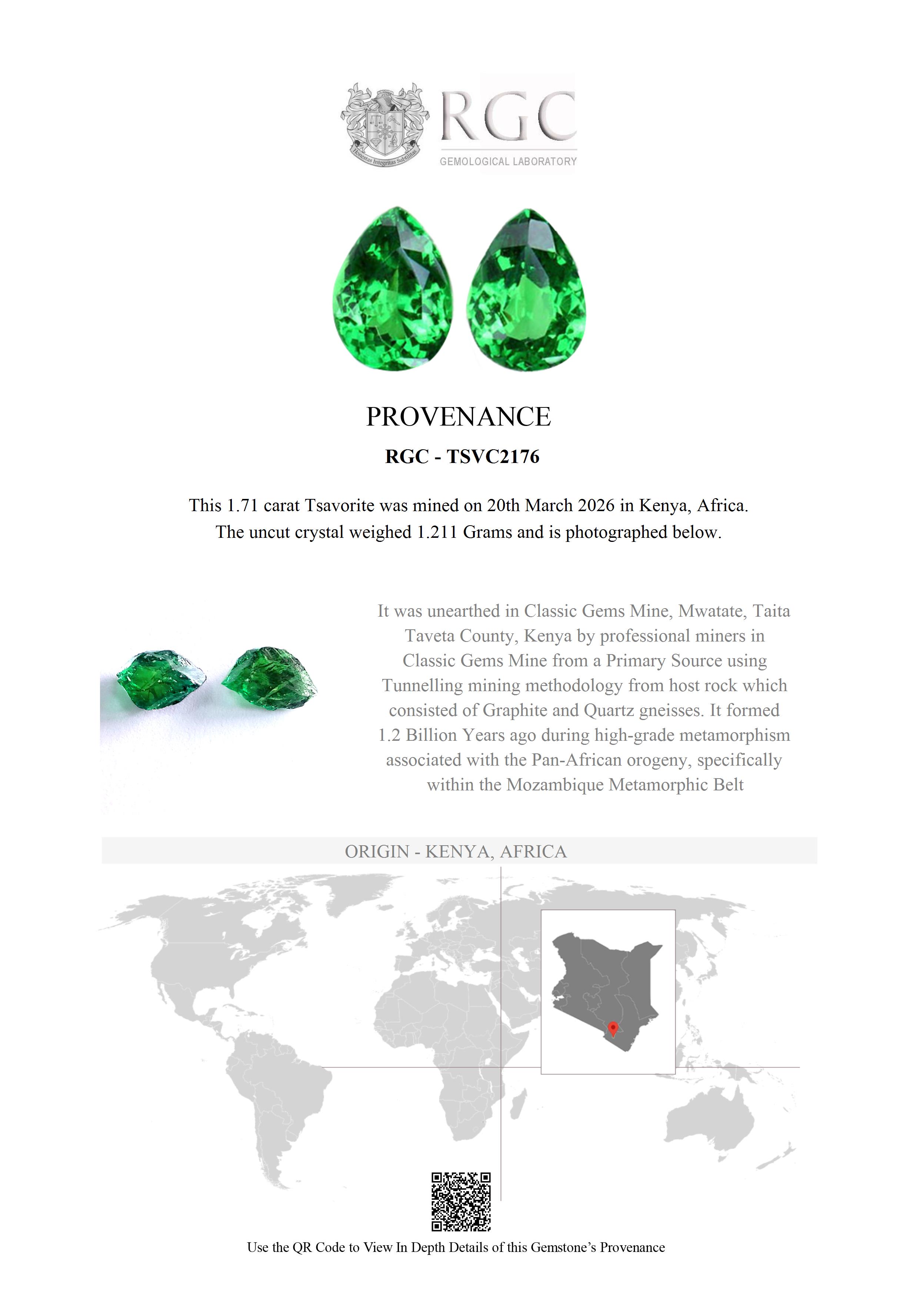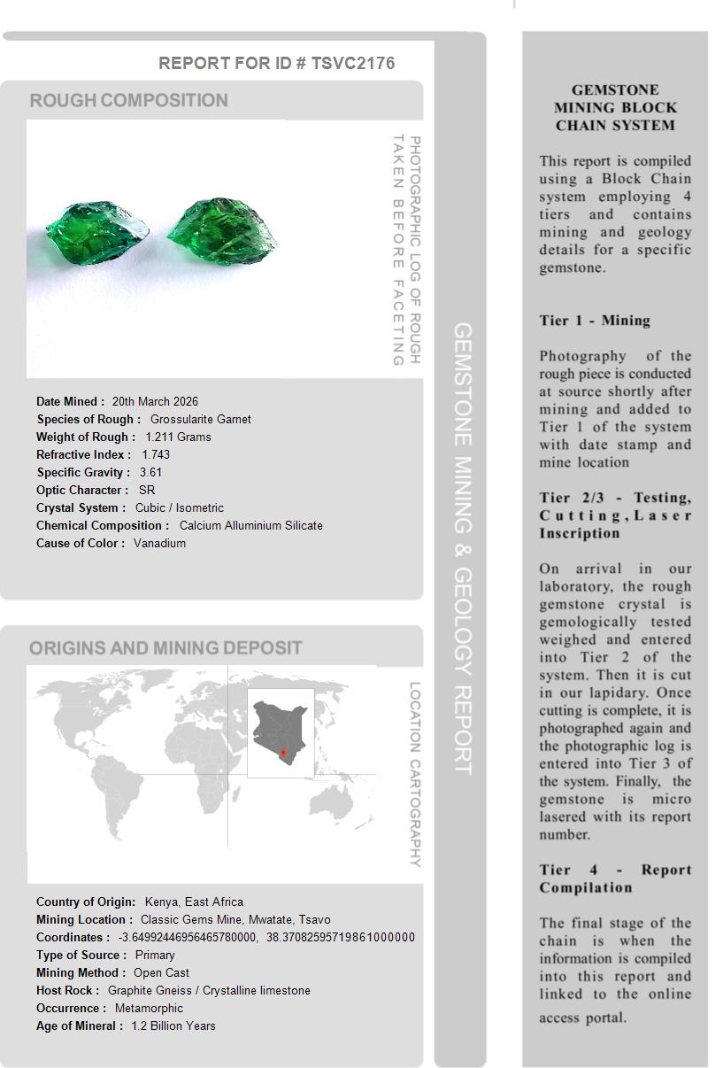 In a lion-infested, dry area of Africa, amongst the Taita Hills of Kenya lies the place where Tsavorite was discovered and first mined. The basement system of rocks within which Tsavorite forms has been dated at between 800 million years and 1.2 billion years old. Tsavorite formed sometime during this time due to a process called “metamorphism”. As magma pushed its way up through the existing rock the contact between the invading magma and the older rock caused a change to occur. The intense heat (as high as, and exceeding 750 degrees centigrade (about 1,530 degrees Fahrenheit) made the nearby minerals recrystallize into minerals stable at the higher temperature. These Tsavorites were amongst these. Millions of years later, as miners chiseled away at the mine face in the Wandani mining area they came across a “potato” or gem pocket. They chiseled it open and inside was a concentration of intense green gem quality Tsavorite. This was carefully clipped away from the host rock and collected into a “parcel” which was taken to Nairobi. Here, in the Lapigems offices they were bought and “knocked” in order to remove heavily included sections. These clean crystals were then examined and cut. This beautiful pair of Tsavorites were some of these, and what you see before you today is many hundreds of millions of years old and a true gift of nature.