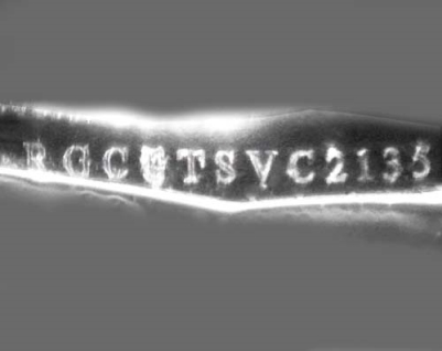 This image is an actual photograph of the laser inscription on this particular gemstone. Photography is done using a microscope camera at 45 x magnification to render the image.