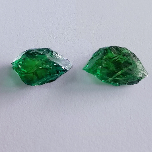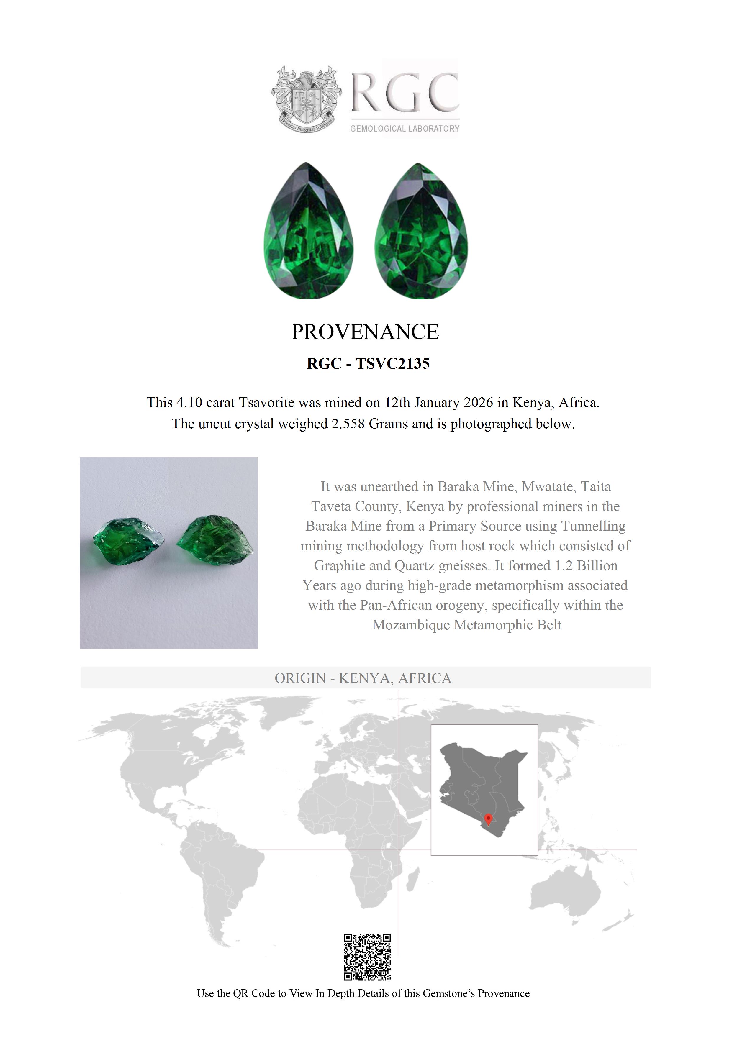 In a lion-infested, dry area of Africa, amongst the Taita Hills of Kenya lies the place where Tsavorite was discovered and first mined. The basement system of rocks within which Tsavorite forms has been dated at between 800 million years and 1.2 billion years old. Tsavorite formed sometime during this time due to a process called “metamorphism”. As magma pushed its way up through the existing rock the contact between the invading magma and the older rock caused a change to occur. The intense heat (as high as, and exceeding 750 degrees centigrade (about 1,530 degrees Fahrenheit) made the nearby minerals recrystallize into minerals stable at the higher temperature. These Tsavorites were amongst these. Millions of years later, as miners chiseled away at the mine face in the Wandani mining area they came across a “potato” or gem pocket. They chiseled it open and inside was a concentration of intense green gem quality Tsavorite. This was carefully clipped away from the host rock and collected into a “parcel” which was taken to Nairobi. Here, in the Lapigems offices they were bought and “knocked” in order to remove heavily included sections. These clean crystals were then examined and cut. This beautiful pair of Tsavorites were some of these, and what you see before you today is many hundreds of millions of years old and a true gift of nature.