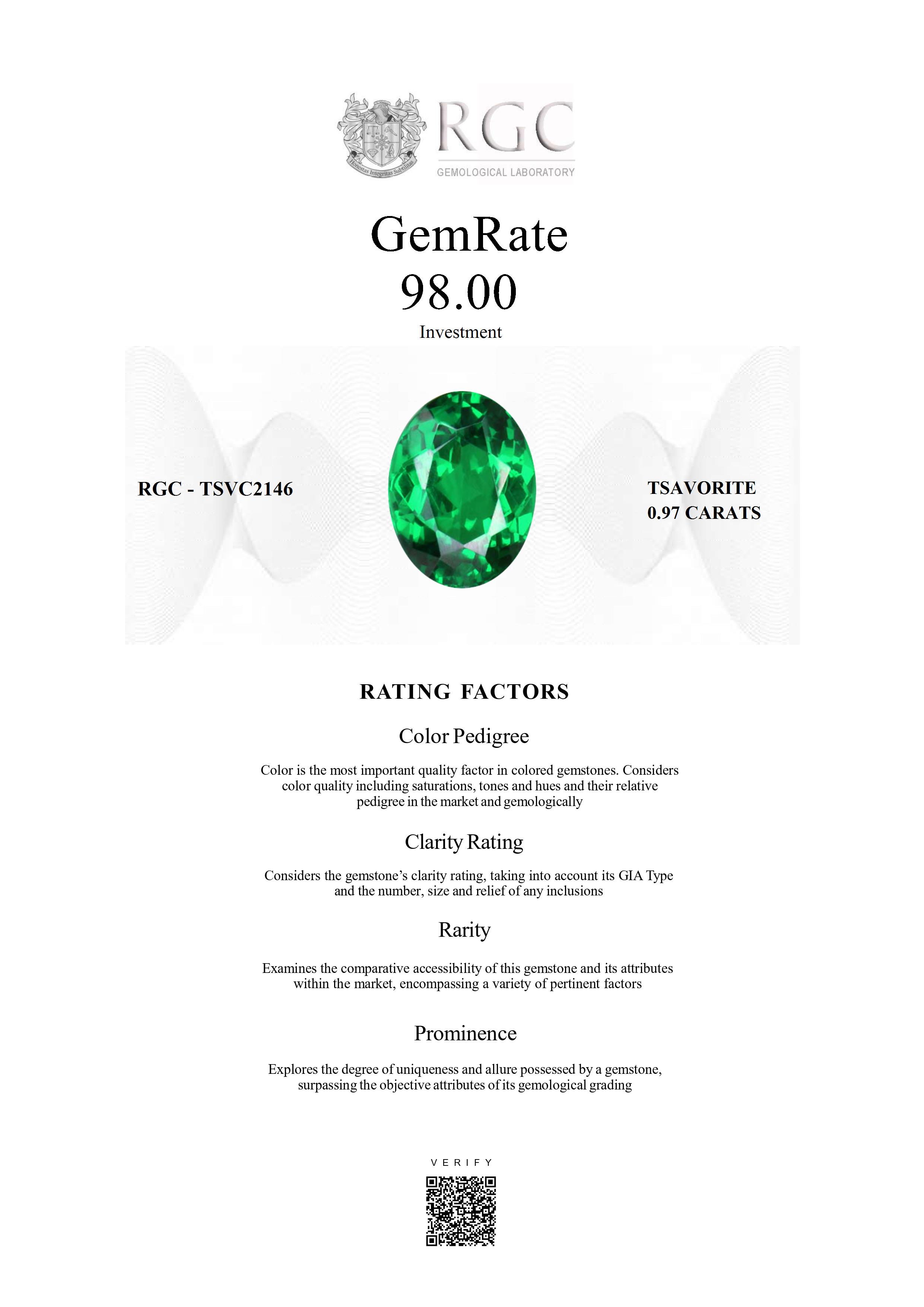 The RGC GemRate is a revolutionary system that addresses the importance and difficulty of comparing different colored gemstones with their peers in the marketplace. It assesses a wide variety of factors that exist in the marketplace and gemologically to classify gems in their genre using a standardized rating system. These factors are myriad but include quantifiable factors like color grade, clarity and cut, rarity factors examining relative rarity and also qualitative factors such as prominence, which examines the degree to which a gemstone stands out and captivates beyond just its measurable quality traits. It's essentially the stone's ability to catch attention and distinguish itself from others.