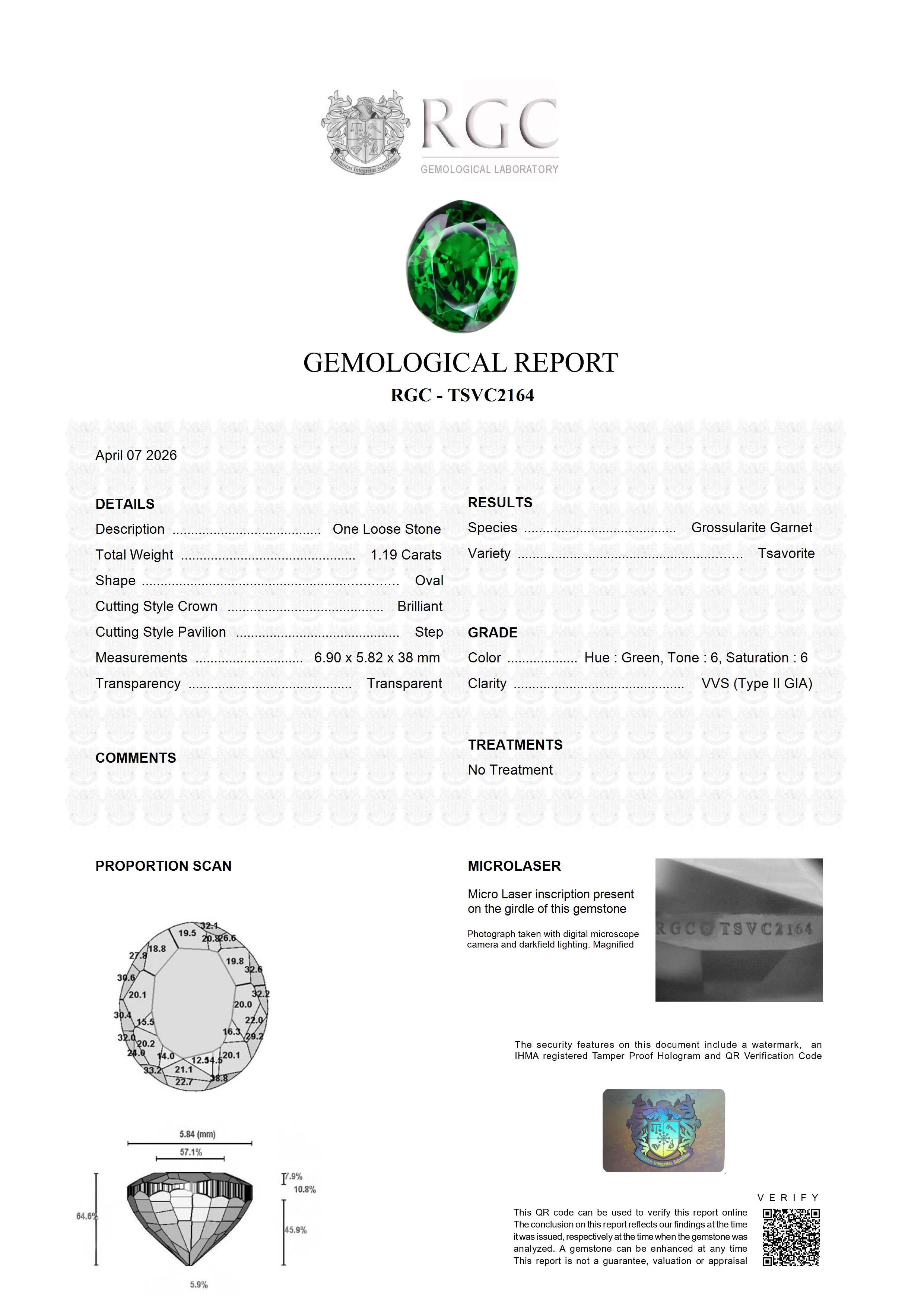 A captivating 1.19-carat oval tsavorite, this gemstone radiates an exceptionally deep and vividly pure green hue—an intensity that immediately commands attention. Its color is both rich and luminous, revealing ethereal depths that seem to shift and glow with every movement of light. Exhibiting flawless clarity, the stone allows uninterrupted brilliance to pass through its finely cut facets, enhancing its natural vibrancy and creating a mesmerizing internal life. The oval shape lends a timeless elegance, perfectly balancing presence with refinement. This tsavorite would make an extraordinary centerpiece for a fine ring