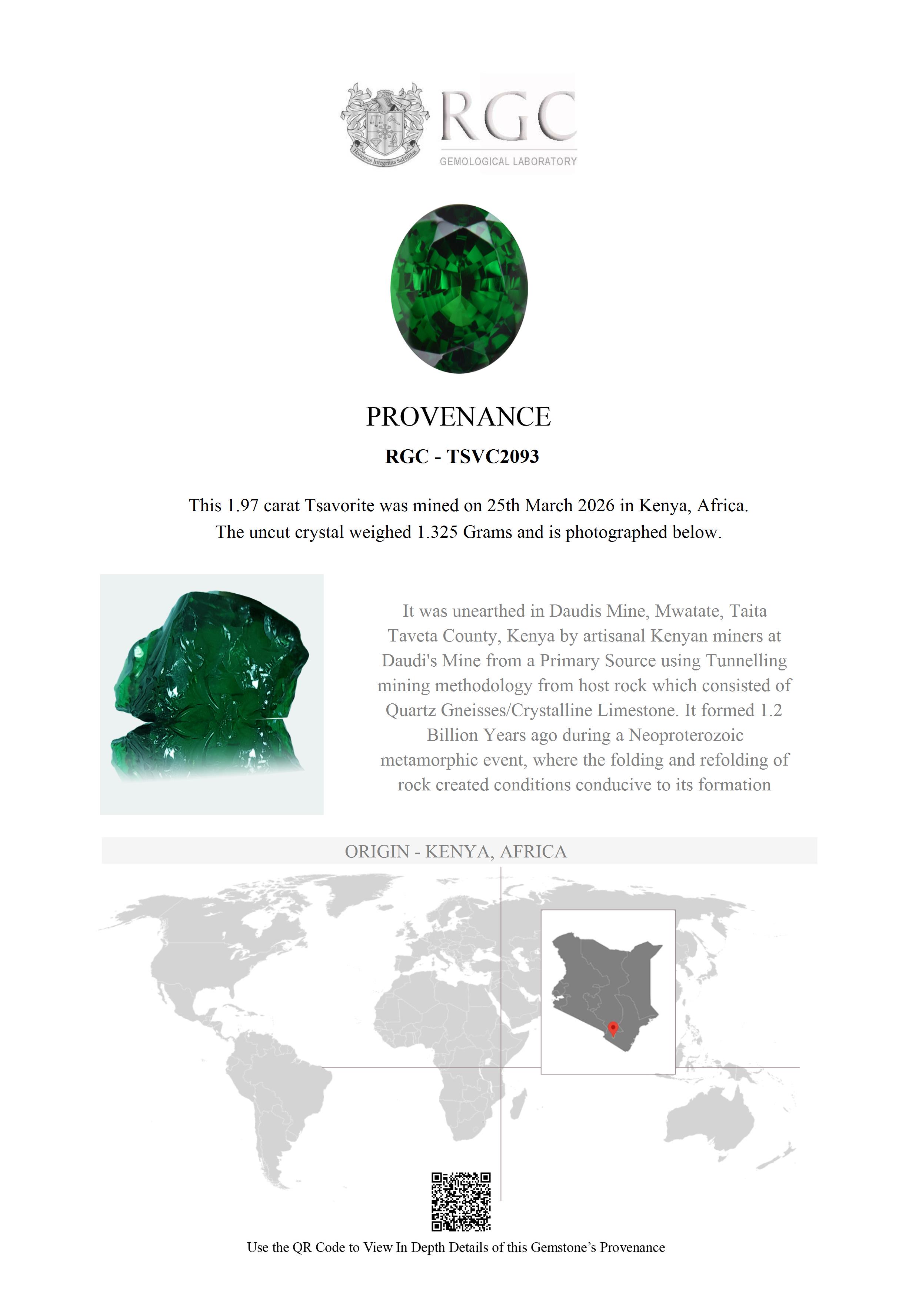 Whilst Tsavorite is found in both Kenya and Tanzania, the very finest Tsavorites are still found in the original deposits based in the Tsavo district of Kenya. Their colors are a purer, unadulterated green hue whilst their Tanzanian counterparts tend to have a strong yellow modifier.