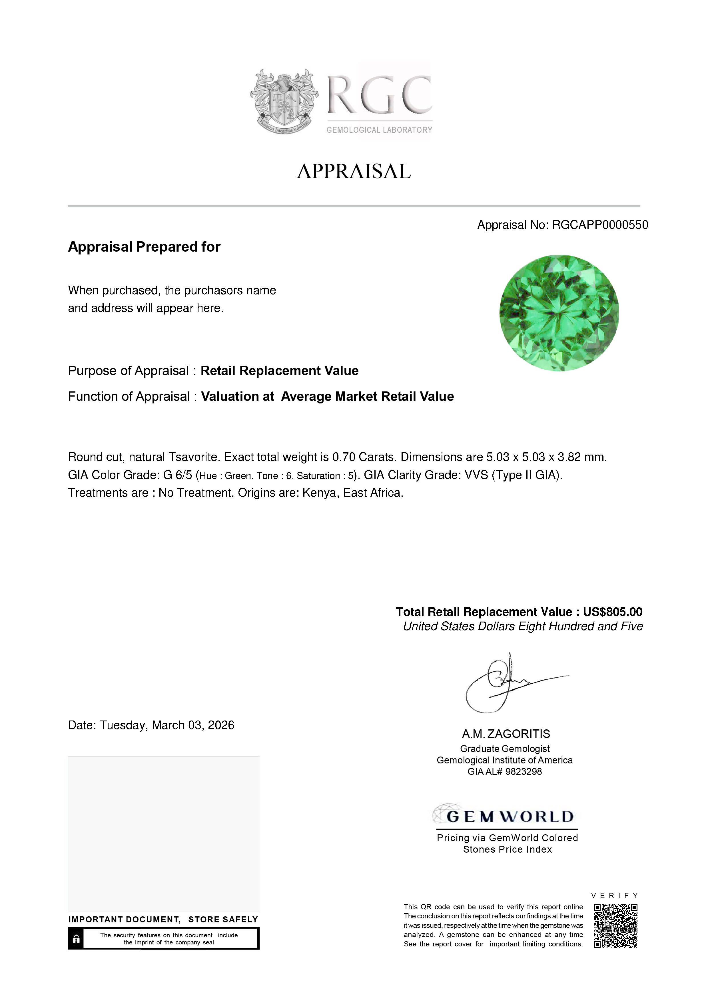 Despite its modest size, this Round Brilliant Tsavorite emanates a striking presence that surpasses its measurements. The stone features a top-of-the-line pure green hue, exhibiting excellent intensity that is very vibrant. Coupled with high clarity, this expertly crafted tsavorite exudes a great deal of brilliance, adding that extra sparkle to its appearance. The combination of color, clarity, and brilliance makes this tsavorite a remarkable jewel that truly stands out in its class.