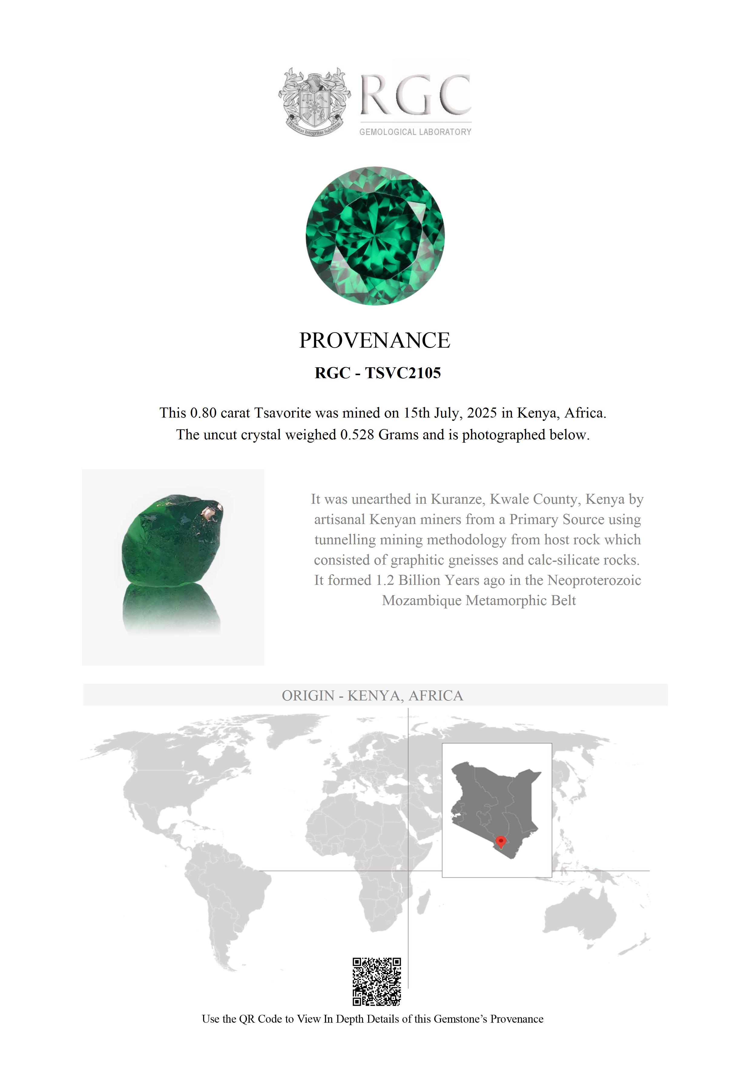 Mined on 15th July, 2025 in Kuranze, Kwale County, Kenya, AfricaThis Tsavorite is over 1.2 Billion Years old. After being removed from the vein and "knocked" to remove the host rock, this Tsavorite weighed 0.528 Grams. The photograph on the left, shows it as it looked at this stage in its journey. Tests showed it has a Specific Gravity of 3.61, an optic character of SR and it formed in the Othorhombic crystal system. Its Chemical Composition is Calcium Alluminium Silicate and its Cause of Color is Vanadium/Chromium