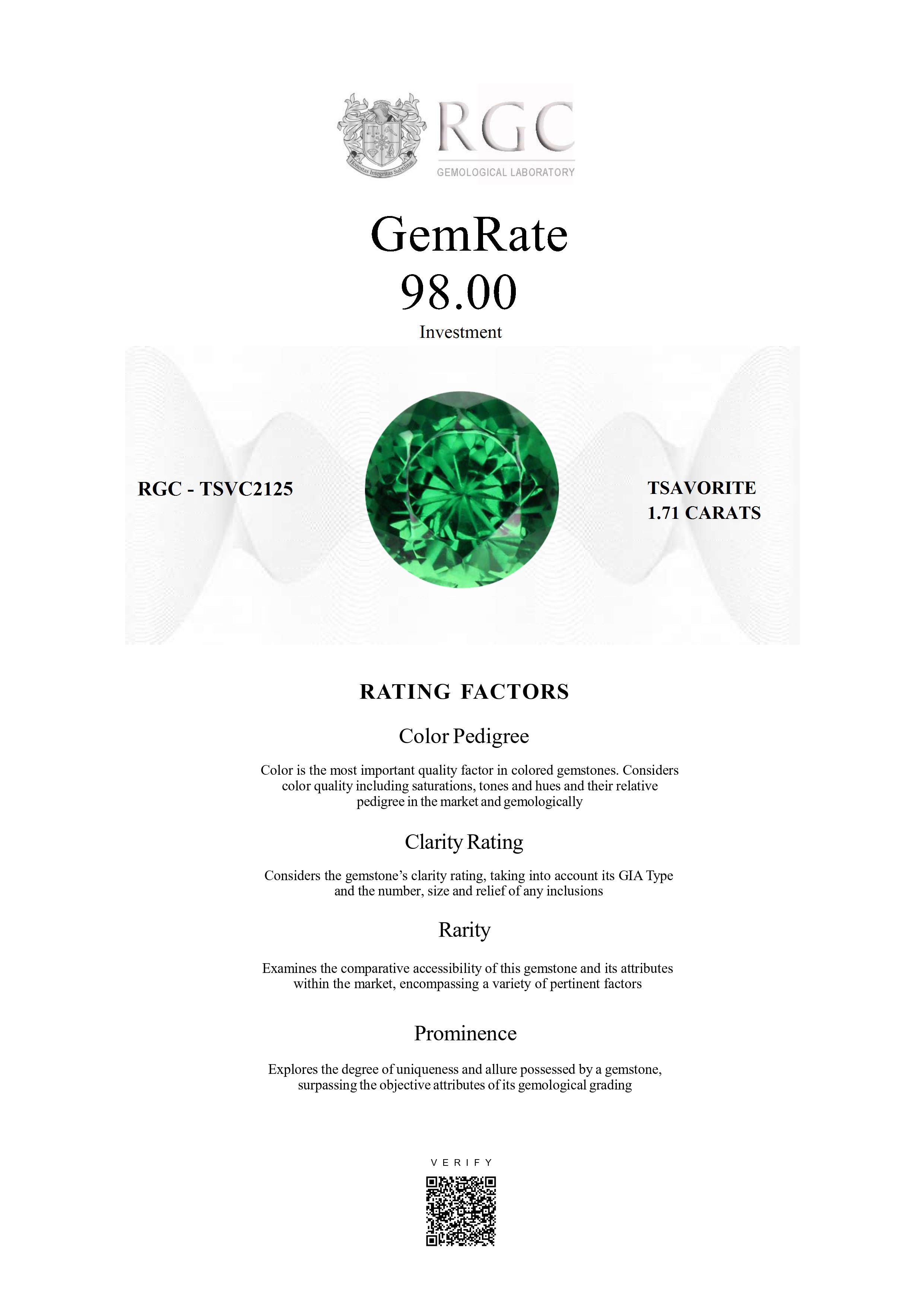 The RGC GemRate is a revolutionary system that addresses the importance and difficulty of comparing different colored gemstones with their peers in the marketplace. It assesses a wide variety of factors that exist in the marketplace and gemologically to classify gems in their genre using a standardized rating system. These factors are myriad but include quantifiable factors like color grade, clarity and cut, rarity factors examining relative rarity and also qualitative factors such as prominence, which examines the degree to which a gemstone stands out and captivates beyond just its measurable quality traits. It's essentially the stone's ability to catch attention and distinguish itself from others.