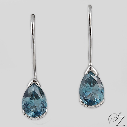 Center Stone: This matched pair of sparkling Aquamarine pears draw you in with their amazing color. Hints of green flashing within the blue is strongly reminiscent of ocean waves glinting in the sunlight. Gorgeous.