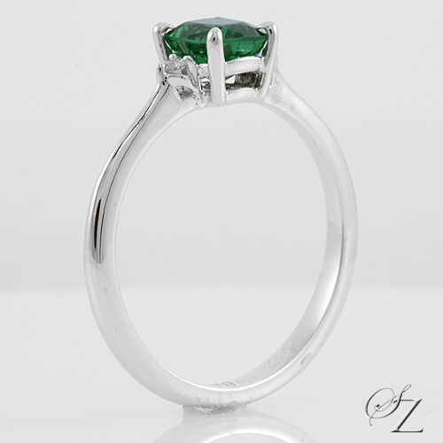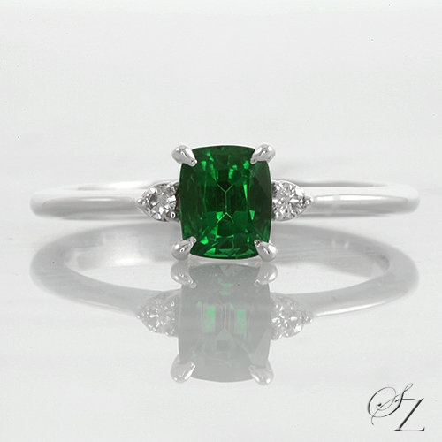 Center Stone: This Tsavorite is extremely beguiling mainly because its color is so exquisite and light really bounces around beautifully within it. Hailing from the renowned Kuranze mine, in the Tsavo area of Kenya, this stone is imbued with the finest, crispest bluish green unique to this deposit. The stone is flawless too which is unusual with Tsavorite. Truly gorgeous.