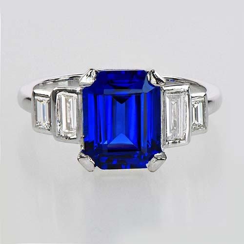 MINING & GEOLOGY REPORT View ReportAn exceptional ring featuring an exquisite central Tanzanite emerald cut with glistening Diamond baguettes on each shoulder on a delicate band of 18k white gold. Breathtaking!