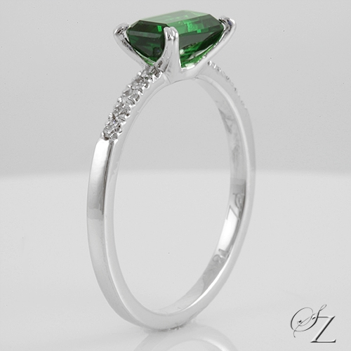 Center Stone: This wonderful 1.17 carat emerald cut literally bursts with color and brightness. Tsavorite's high refractive index has the ability to give it a wonderful shine and this is very much the case with this stone. Very high clarity, the finest color possible and well cut. Truly stunning.
