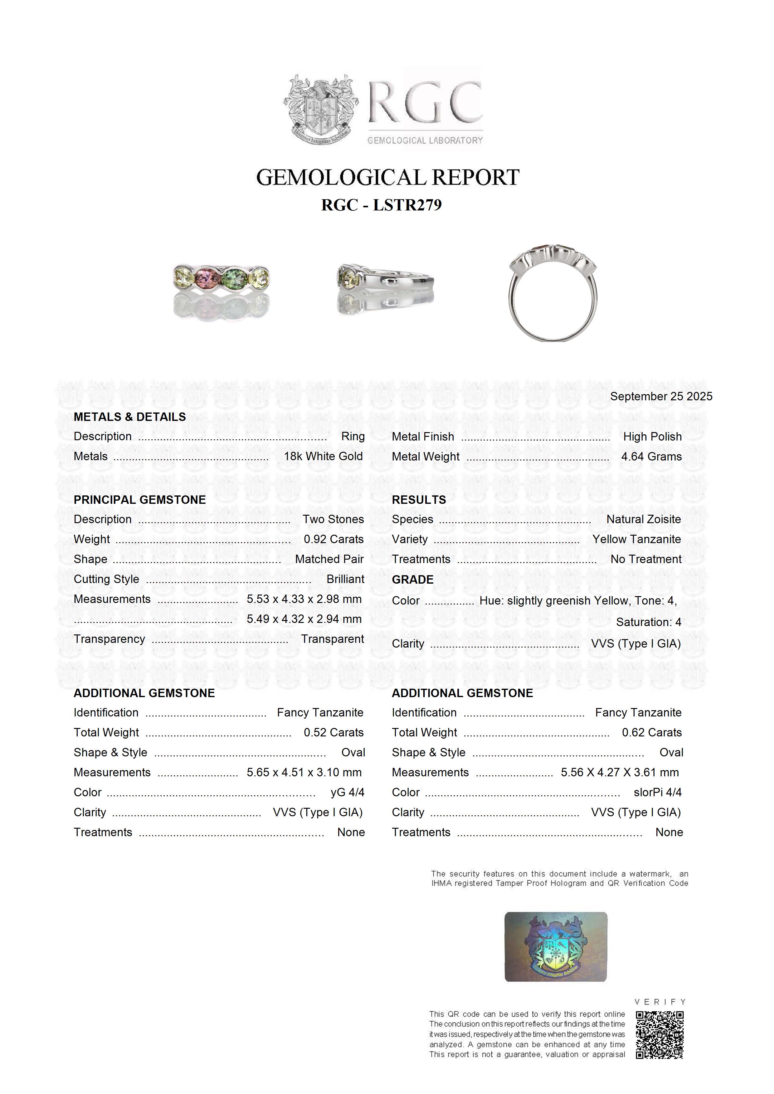 Center Stone: Truly exceptional and very rare. This gorgeous pair of oval crisp yellow Tanzanites are a true collector's item. The yellow hue is incredibly crisp, bright and vivid with very little modifier which is rare. Superb cutting causes the stones to actually glow. Robust trichroism in the dichroscope as to be expected from a Tanzanite with violet, yellow and green showing strongly. A very rare, unique and beautiful pair of gemstones.