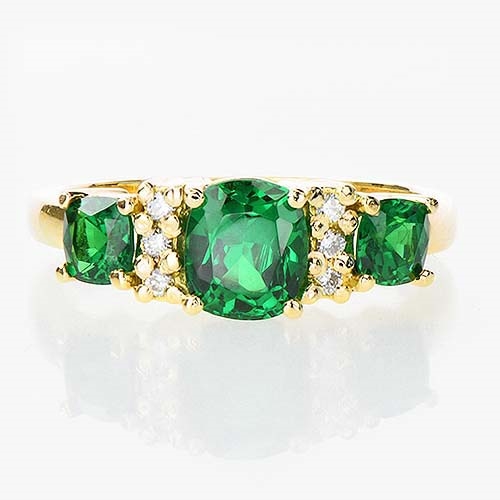 MINING & GEOLOGY REPORT View ReportStriking, flawless Kuranze Tsavorites, radiating with wonderfully hypnotic blue/green hues and glittering white Diamonds in 18k yellow gold. The vibrancy and color of this gorgeous ring will have you captivated forever.