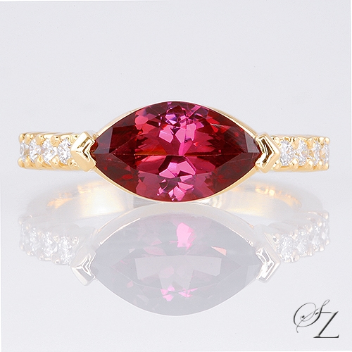 MINING & GEOLOGY REPORT View ReportA marvelous, rich burgundy Rhodolite marquise sits between a trail of shimmering white Diamond accents on an 18k yellow gold band. Sensational!