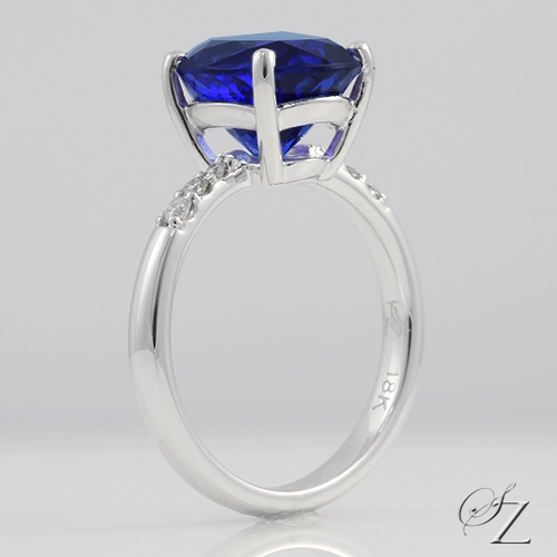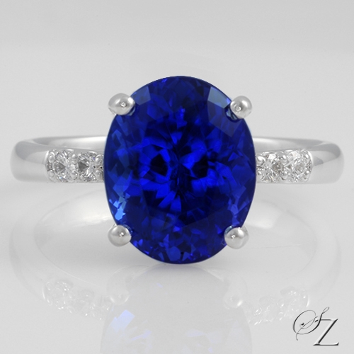 Center Stone: Cut on the blue axis and radiating an overwhelmingly deep, intense color, this superb oval is an outstanding example of a Block D top grade Tanzanite. It is extremely rare to find Tanzanites in this size with this quality of color. Flawless and well cut - a rare and exciting stone.