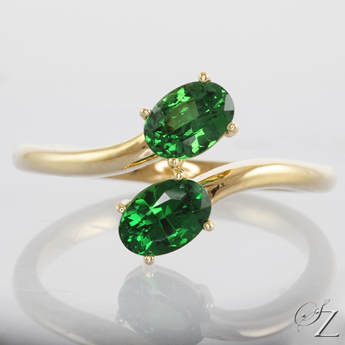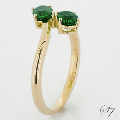 MINING & GEOLOGY REPORT View ReportThis is such a lovely ring! Two wonderfully vivid green Tsavorites set opposite each other in a fine yellow gold band. Delicate, yet very eye catching.