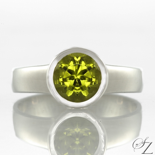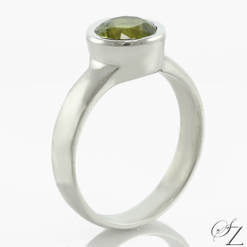 MINING & GEOLOGY REPORT View ReportA lively Ethiopian Peridot bursting with a riot of vivid olive green shards of light nestled in a bezel of sterling silver. A beautiful ring that can be enjoyed every day.
