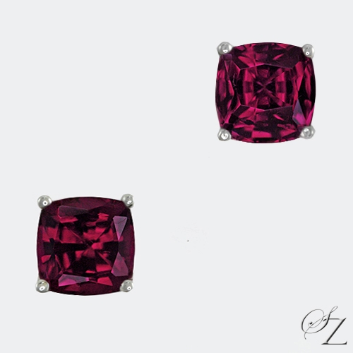 Center Stone: Stunning Rhodolite cushions from Umba, boasting a wonderful purplish red hue. Both stones are flawless and exude life and brilliance.