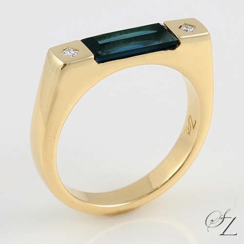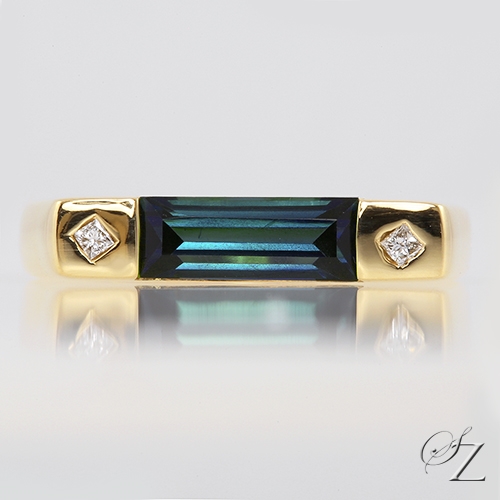 MINING & GEOLOGY REPORT View ReportSleek and sophisticated. This beautiful ring featuring a gorgeous all natural Kenyan Sapphire baguette with a glorious shade of blue, paired with princess cut Diamonds in a warm glowing 18k yellow gold square band. Evoking a wonderful eye catching balance of elegance.
