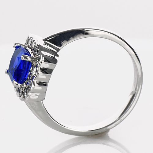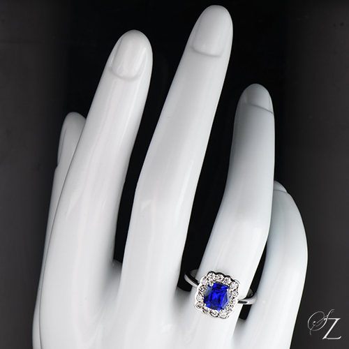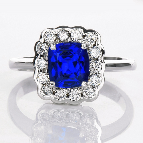 MINING & GEOLOGY REPORT View ReportA pretty, vintage inspired ring featuring a stunning cornflower blue Tanzanite cushion with a delicate scalloped edged Diamond halo. Gorgeous!