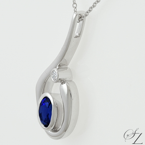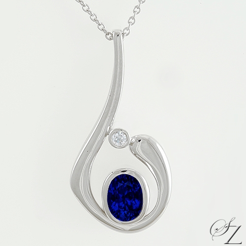 MINING & GEOLOGY REPORT View ReportAn exceptional oval Tanzanite set in a full bezel with a graceful ribbon of white gold that curves luxuriously around the stone and ends in a glistening white Diamond. Stunning!