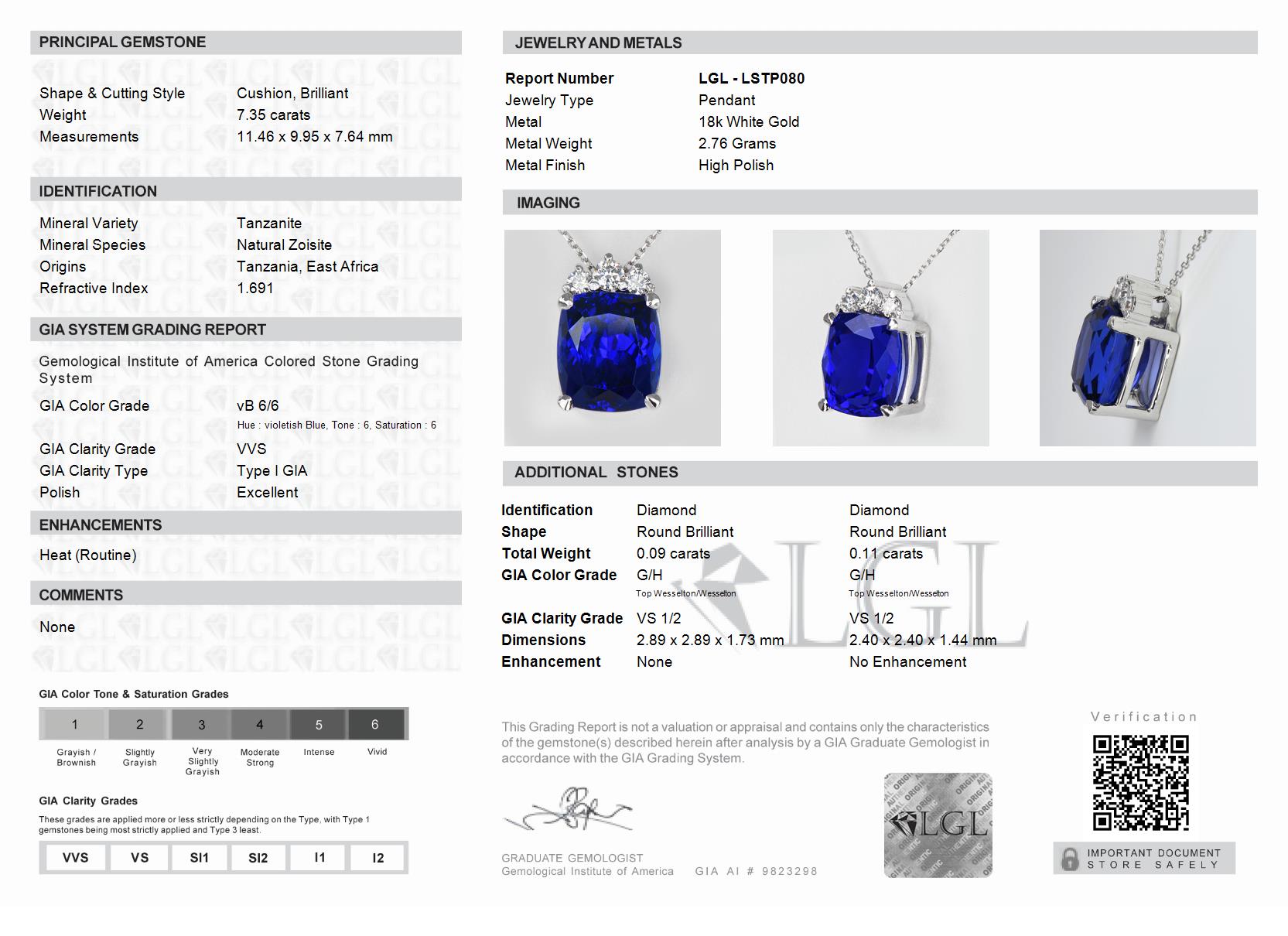 The center stone in this beautiful piece is a 7.35 Carats Tanzanite but it weighed 5.057 Grams in its rough state. The photograph here is the photographic log of it before we cut it. We include a full Mining and Geology Report with the piece when it ships so that you have a full genealogy for your unique Pendant.