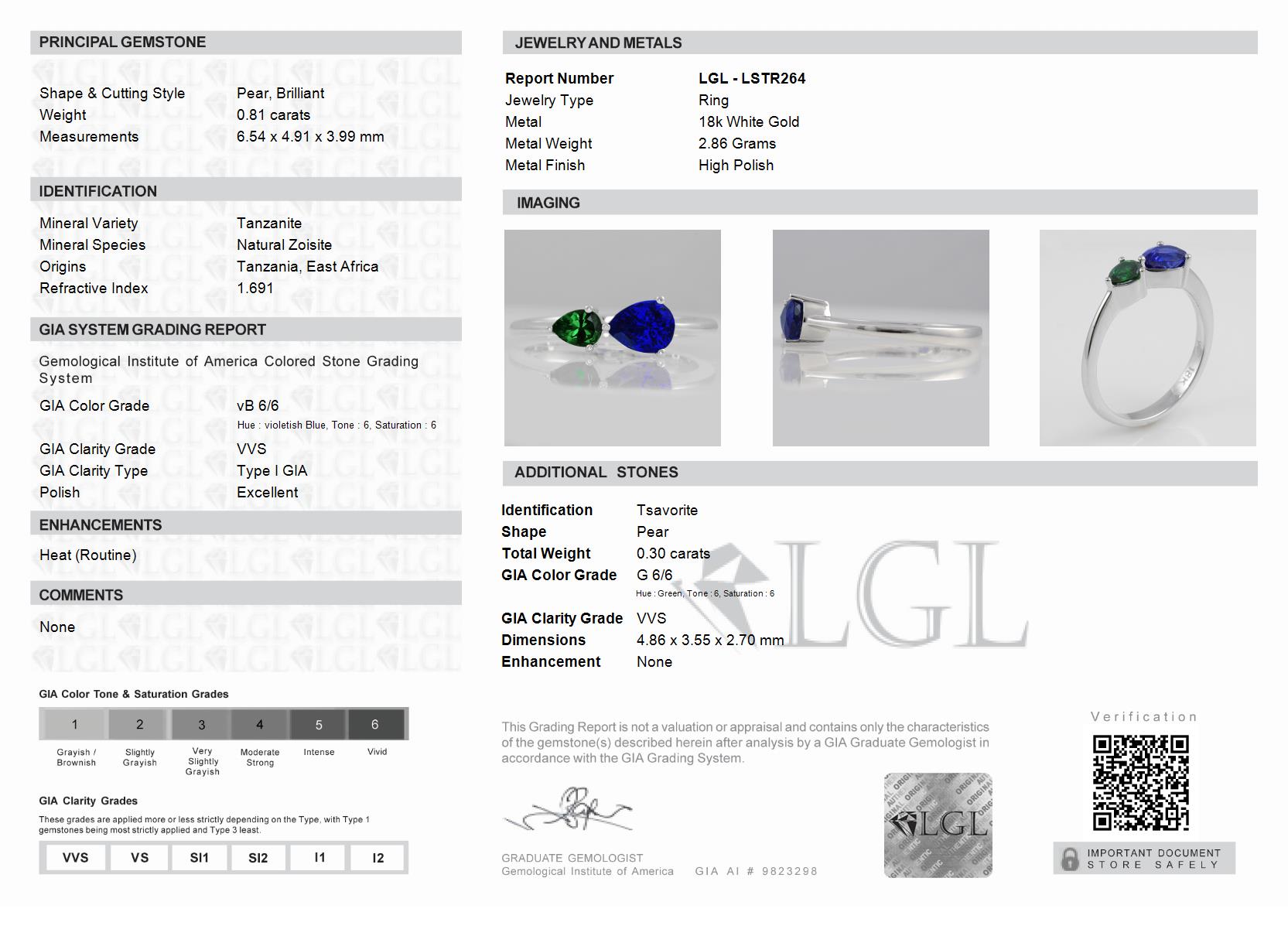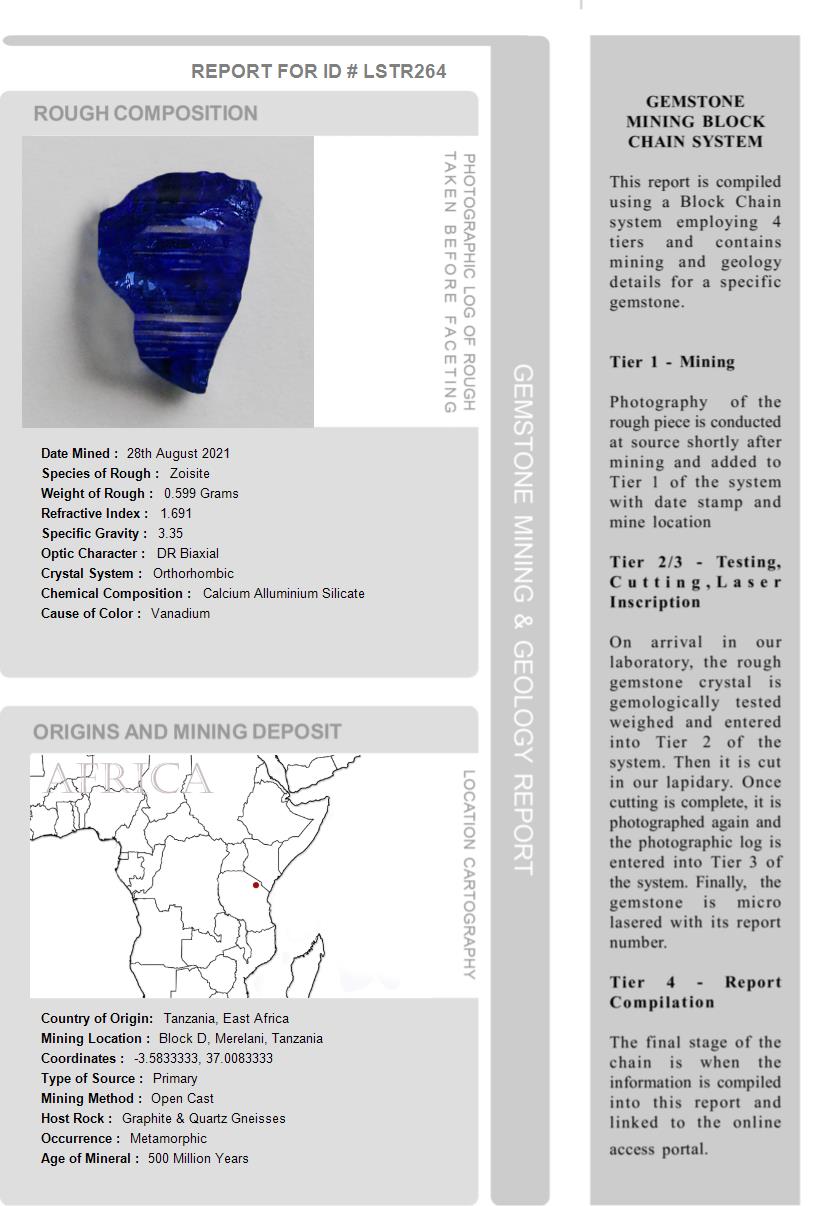 More About the DesignerThe center stone in this beautiful piece is a 0.81 Carats Tanzanite but it weighed 0.599 Grams in its rough state. The photograph here is the photographic log of it before we cut it. We include a full Mining and Geology Report with the piece when it ships so that you have a full genealogy for your unique Ring.
