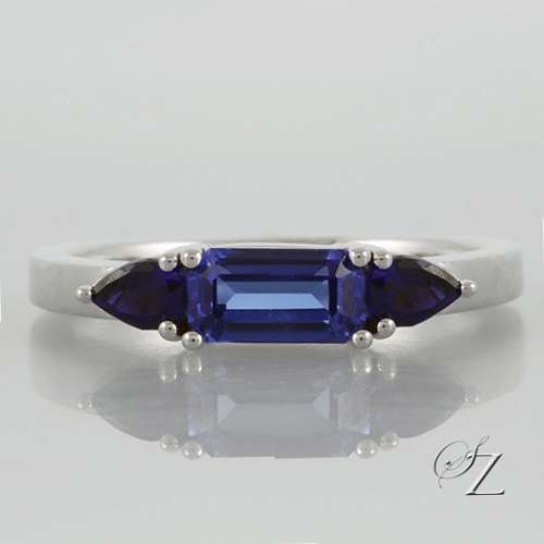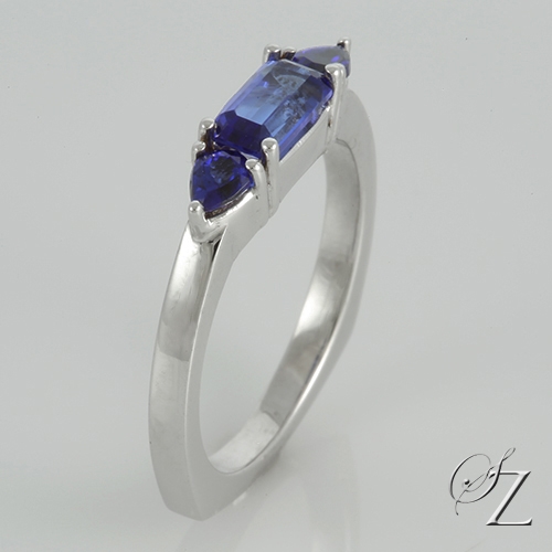 MINING & GEOLOGY REPORT View ReportA modern take on a classic three stone ring. A flawless, vivid blue Tanzanite emerald cut flanked by equally gorgeous Tanzanite pears. Stylish and elegant in a traditional setting.