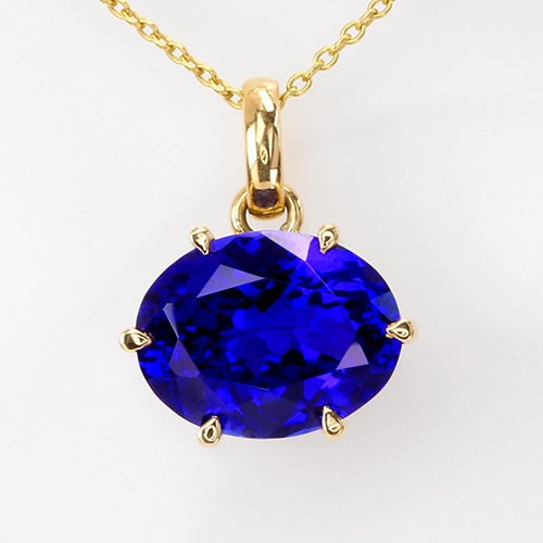 MINING & GEOLOGY REPORT View ReportAn incredible deep, satin blue Tanzanite oval, horizontally set with six pointed prongs of 18k yellow gold. Chic, bold and incredibly eye-catching.