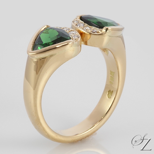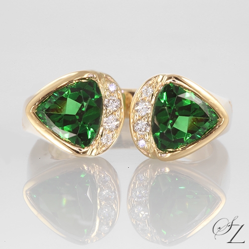 MINING & GEOLOGY REPORT View ReportA ring to command attention! Two gorgeously green, flawless trillions set in a contemporary full bezel of yellow gold, with Diamond accents between to heighten the sparkle and compliment the vivid green shards of light emanating from deep within the Tsavorities.