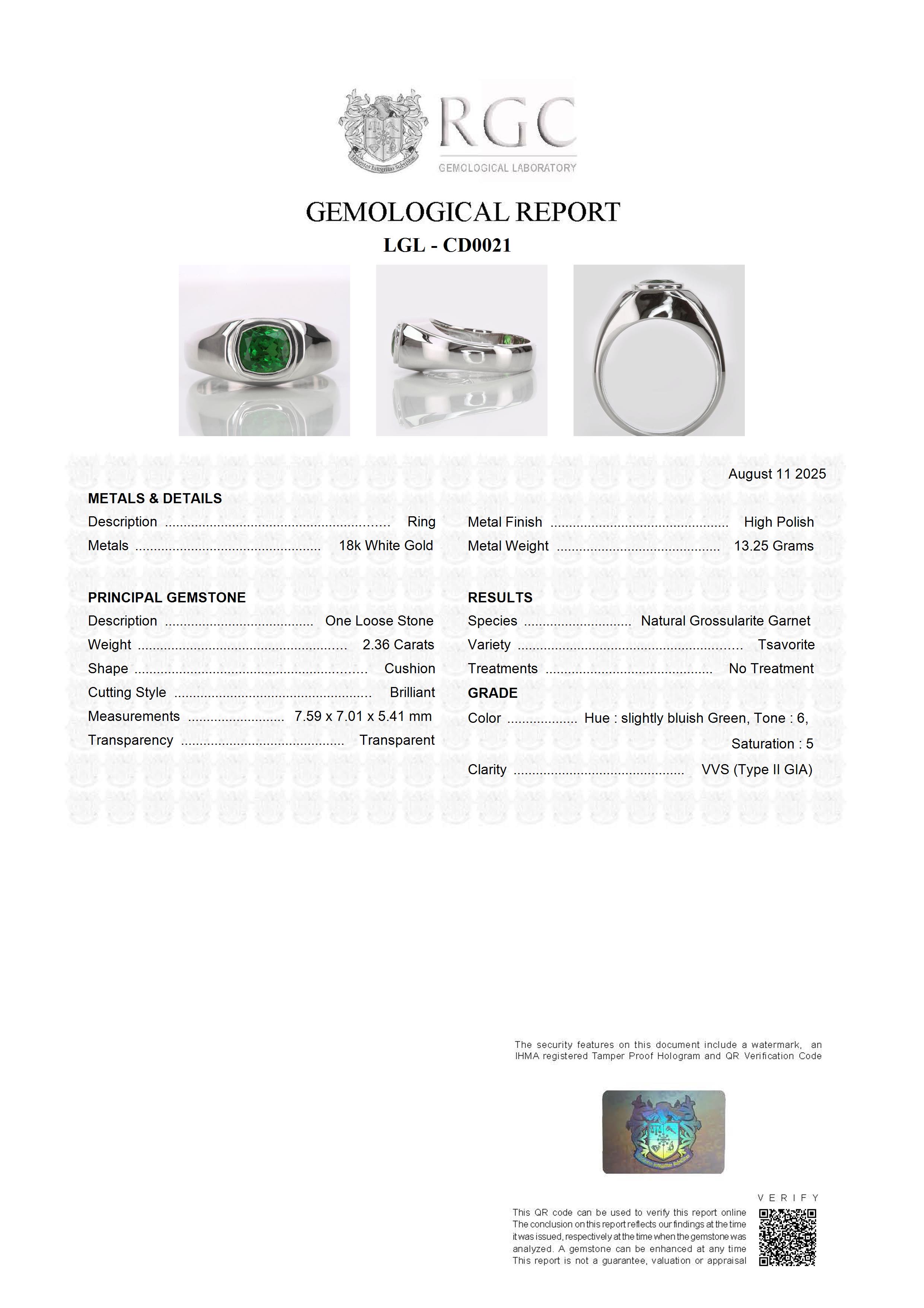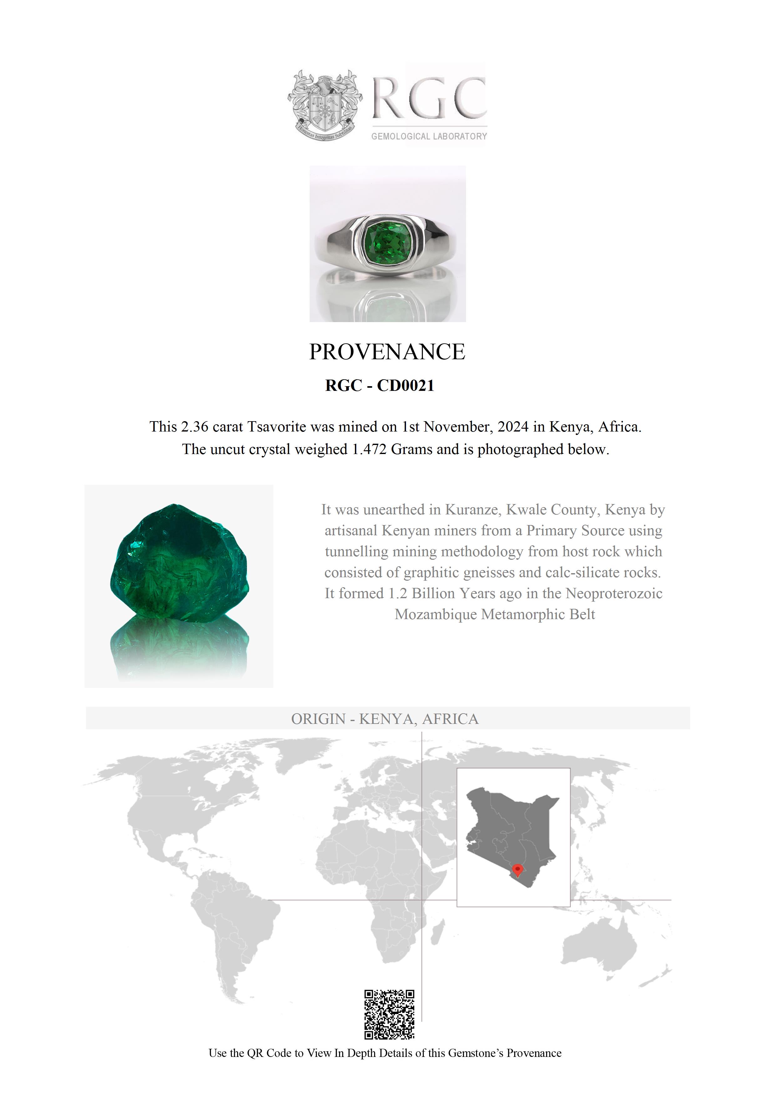 The center stone in this beautiful piece is a 2.36 Carats Tsavorite but it weighed 1.472 Grams in its rough state. The photograph here is the photographic log of it before we cut it. We include a full Mining and Geology Report with the piece when it ships so that you have a full genealogy for your unique Ring.