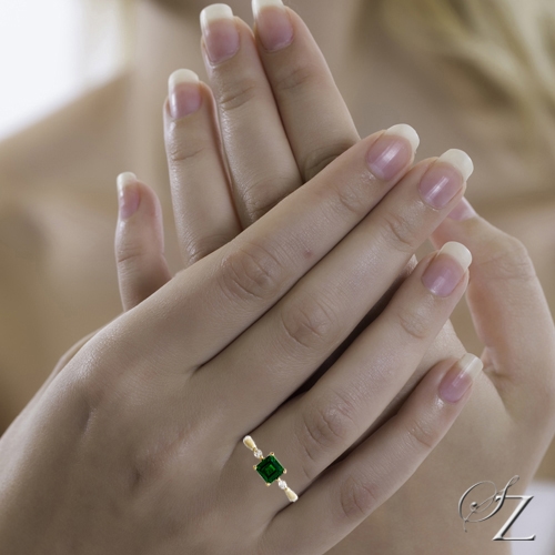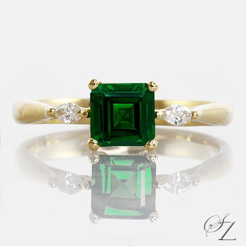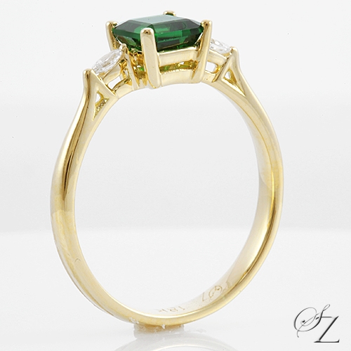 MINING & GEOLOGY REPORT View ReportThis lovely ring exudes a sense of minimalism with a fine handcrafted touch. Tiny but fine marquise Diamonds set subtly on each side of a glowing square emerald cut Tsavorite. Very chic.