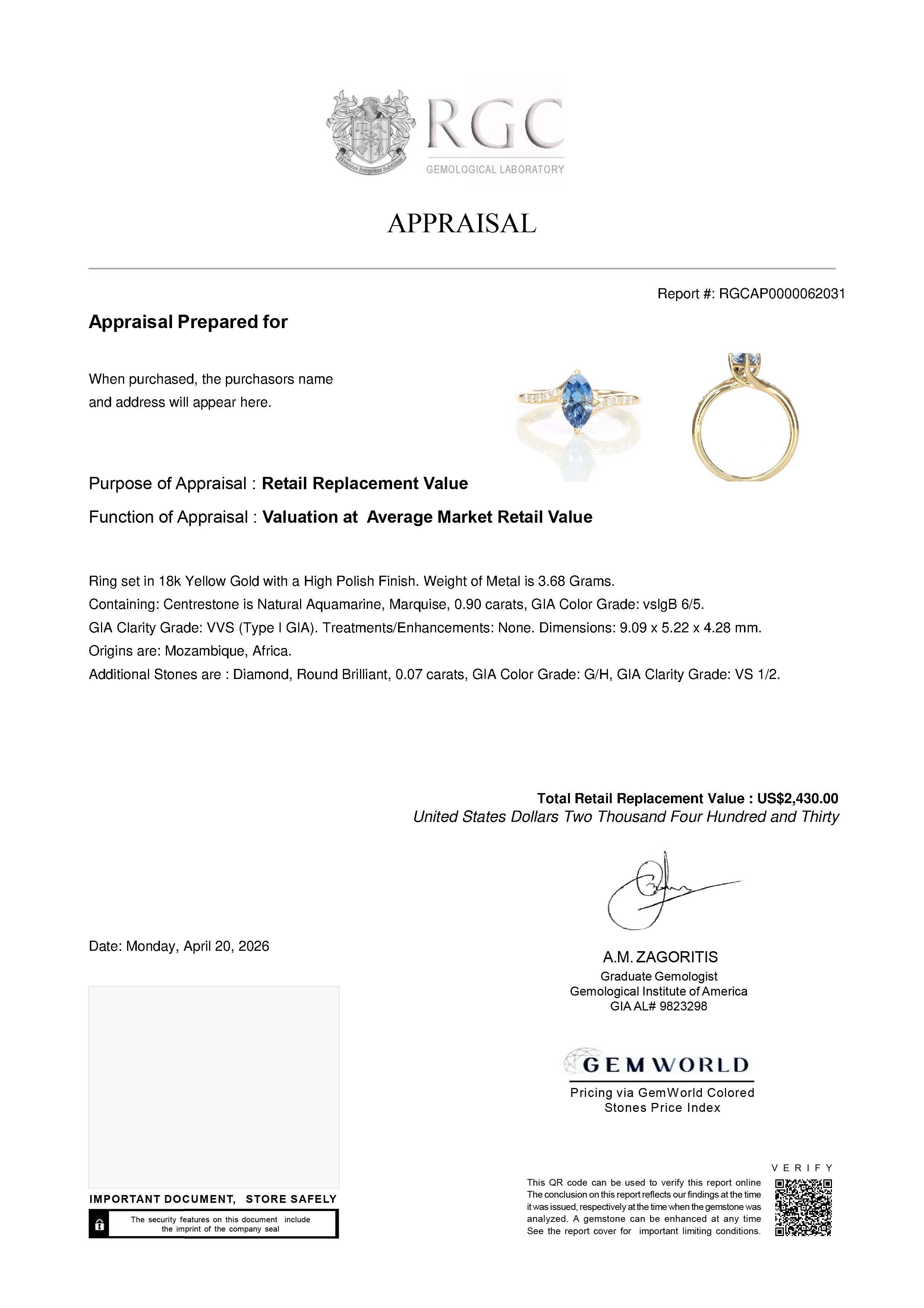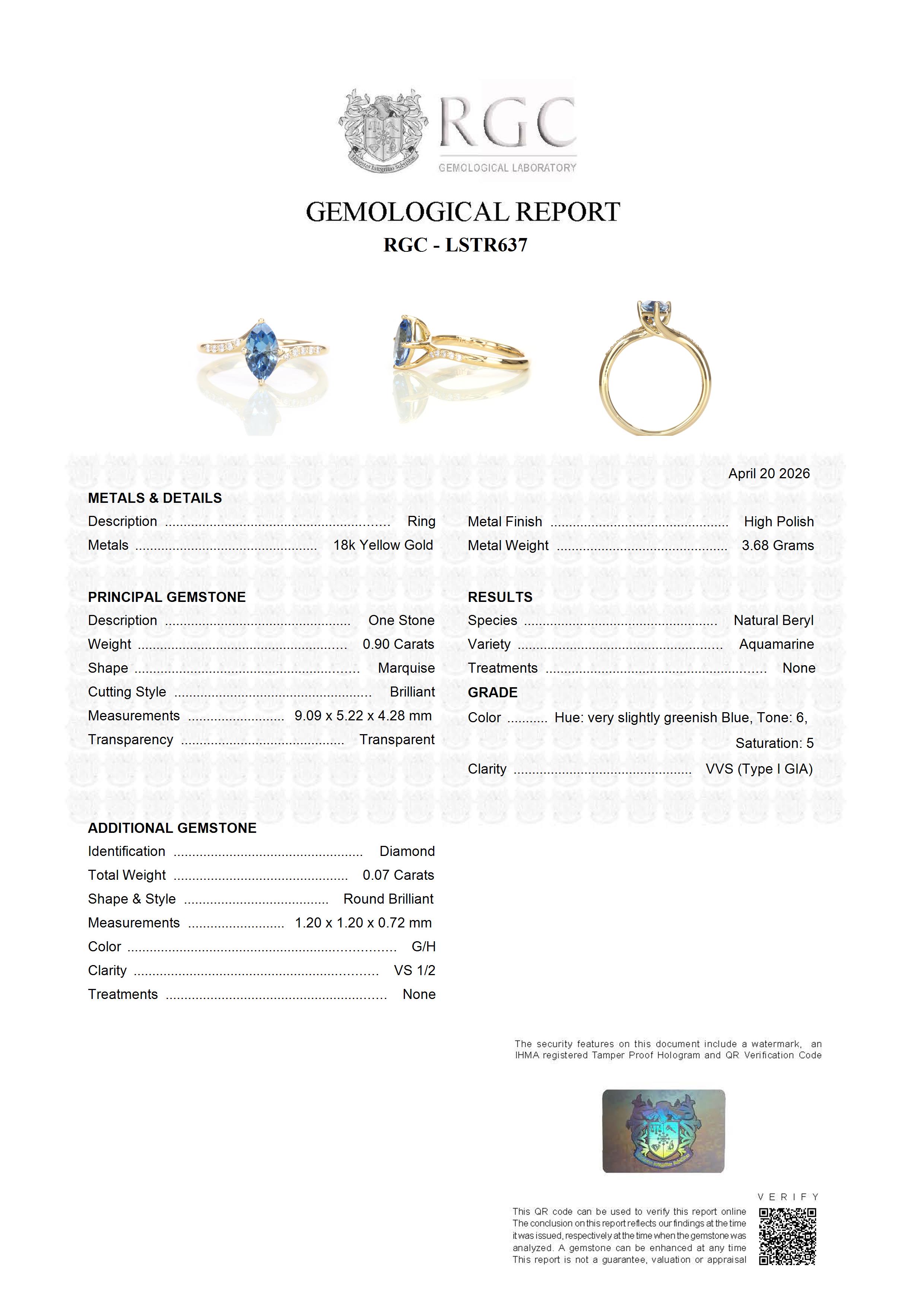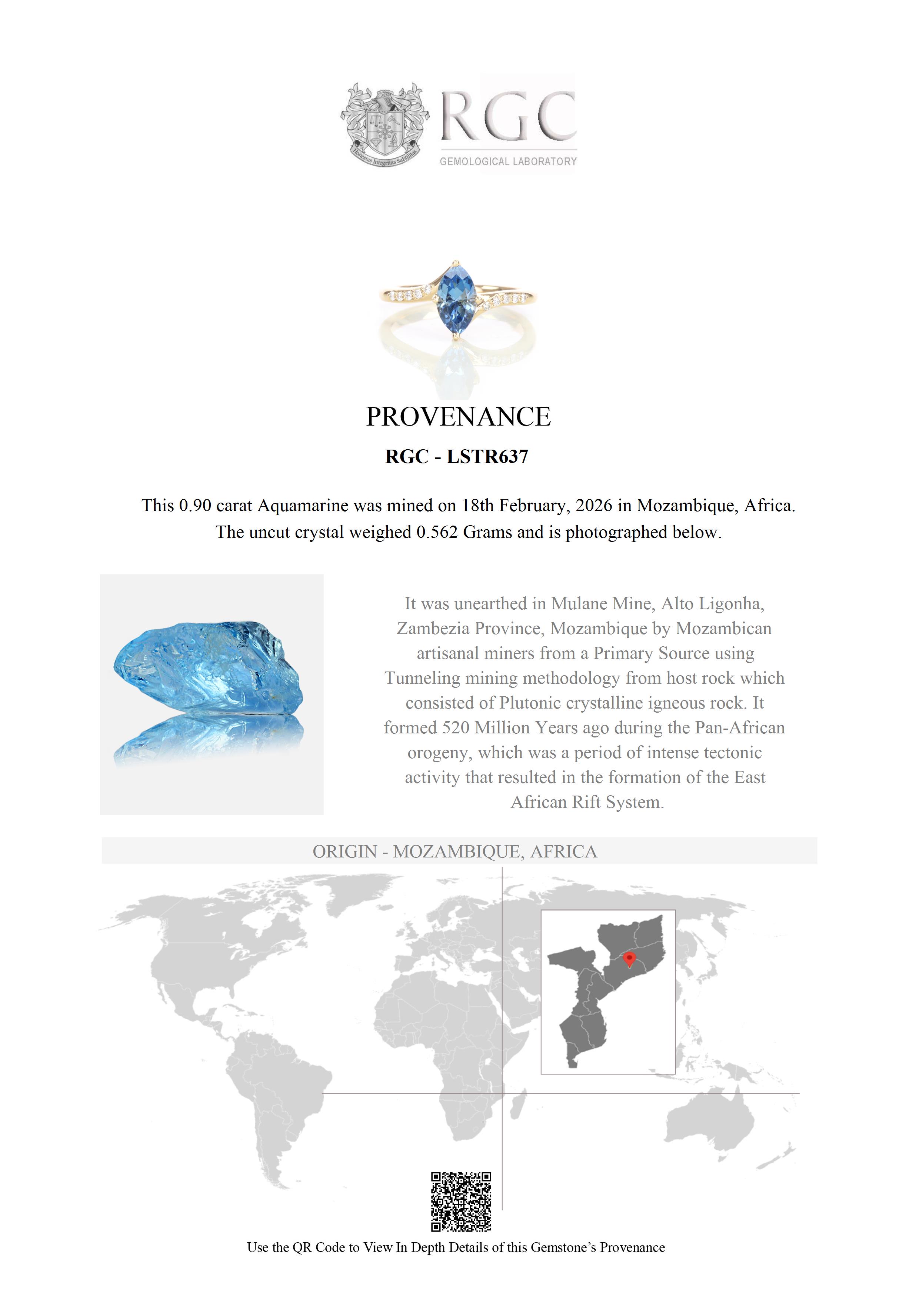 The center stone in this beautiful piece is a 0.90 Carats Aquamarine but it weighed 0.562 Grams in its rough state. The photograph here is the photographic log of it before we cut it. We include a full Mining and Geology Report with the piece when it ships so that you have a full genealogy for your unique Ring.