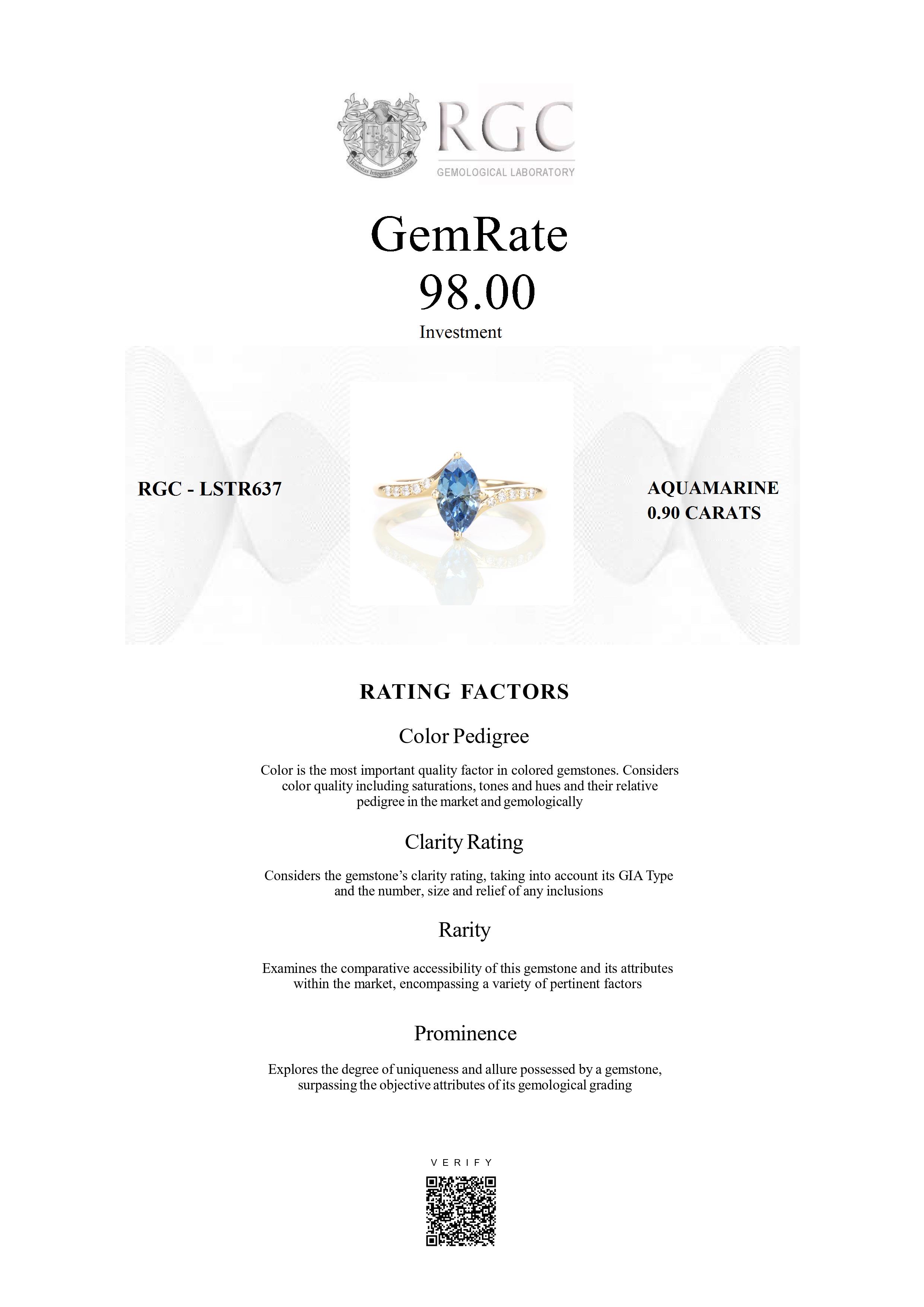 The RGC GemRate is a revolutionary system that addresses the importance and difficulty of comparing different colored gemstones with their peers in the marketplace. It assesses a wide variety of factors that exist in the marketplace and gemologically to classify gems in their genre using a standardized rating system. These factors are myriad but include quantifiable factors like color grade, clarity and cut, rarity factors examining relative rarity and also qualitative factors such as prominence, which examines the degree to which a gemstone stands out and captivates beyond just its measurable quality traits. It's essentially the stone's ability to catch attention and distinguish itself from others.