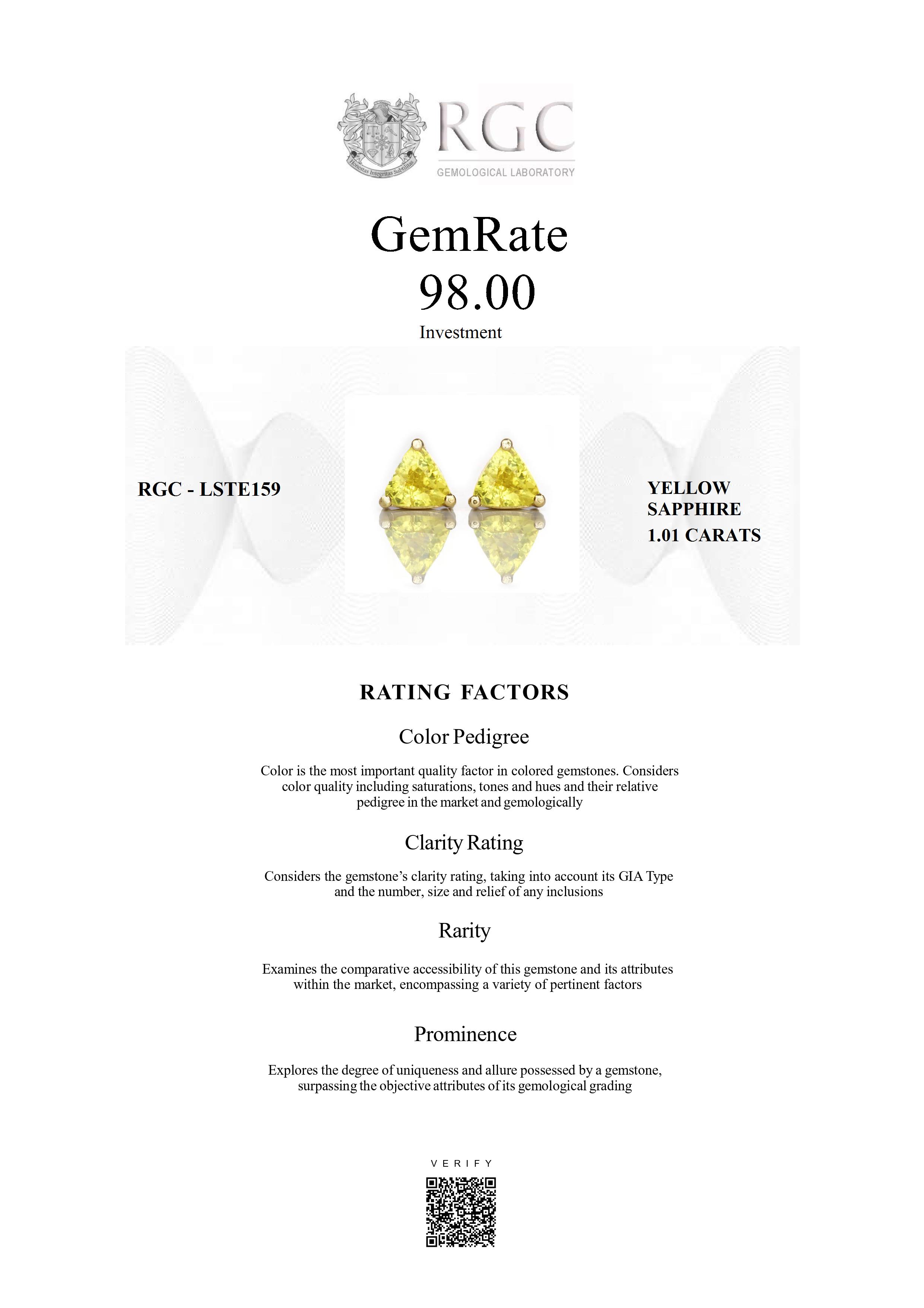 The RGC GemRate is a revolutionary system that addresses the importance and difficulty of comparing different colored gemstones with their peers in the marketplace. It assesses a wide variety of factors that exist in the marketplace and gemologically to classify gems in their genre using a standardized rating system. These factors are myriad but include quantifiable factors like color grade, clarity and cut, rarity factors examining relative rarity and also qualitative factors such as prominence, which examines the degree to which a gemstone stands out and captivates beyond just its measurable quality traits. It's essentially the stone's ability to catch attention and distinguish itself from others.