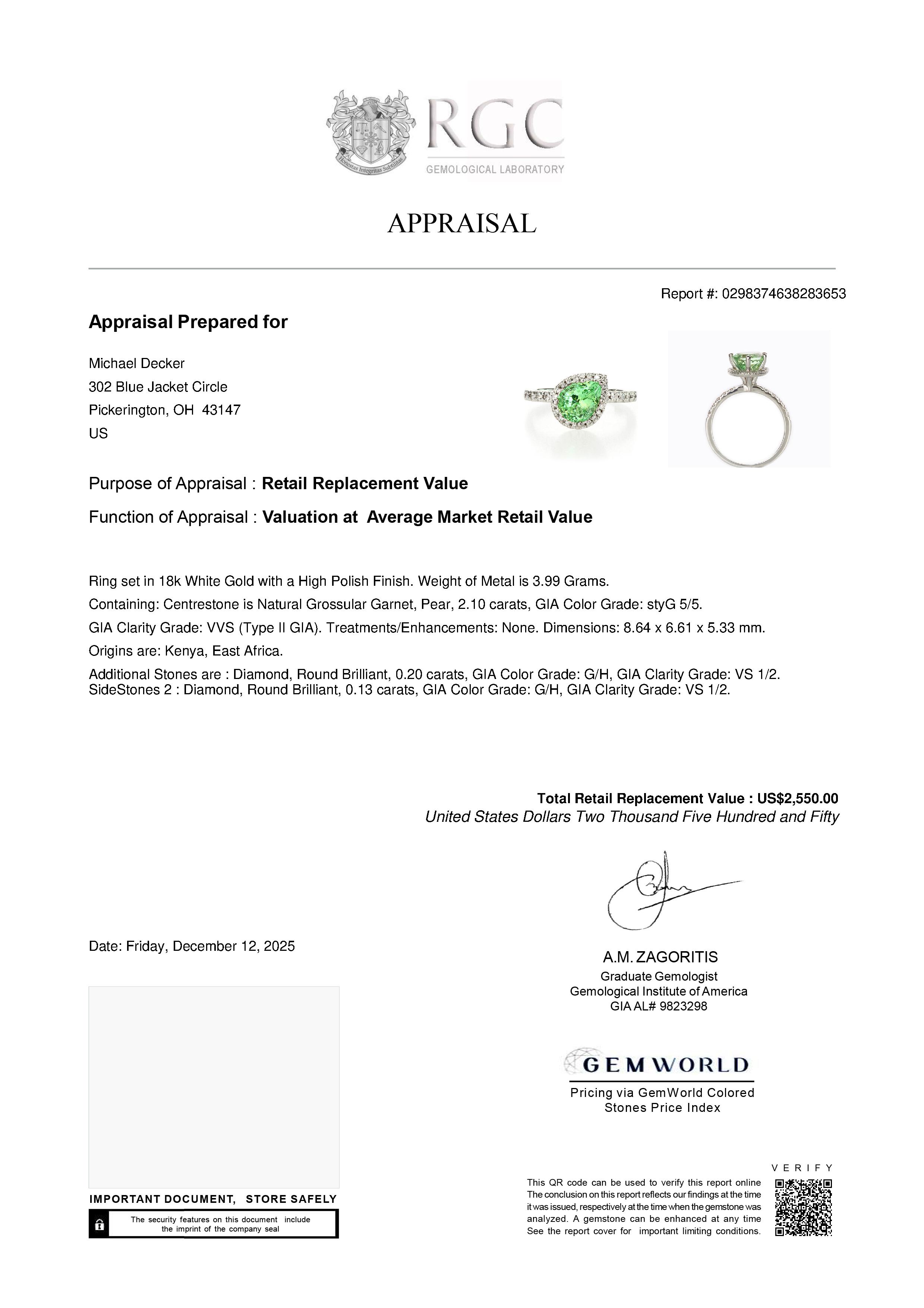 A. This appraisal has been prepared by a GIA Graduate Gemologist using specialist Appraisal Software.This software employs the following:
