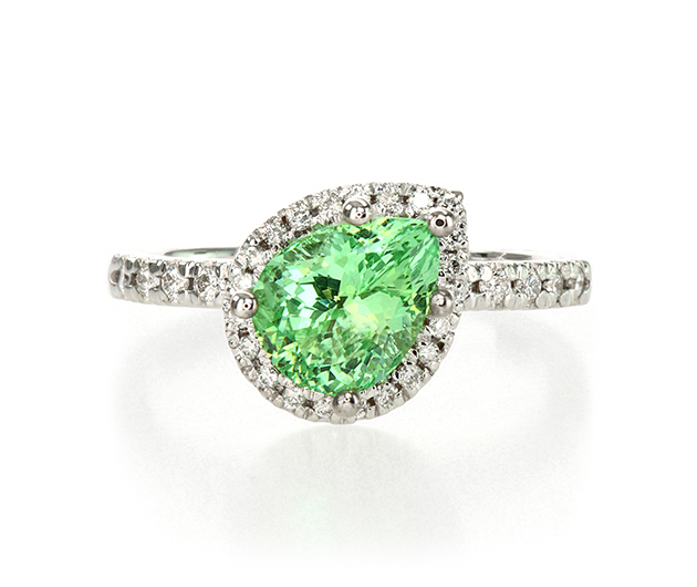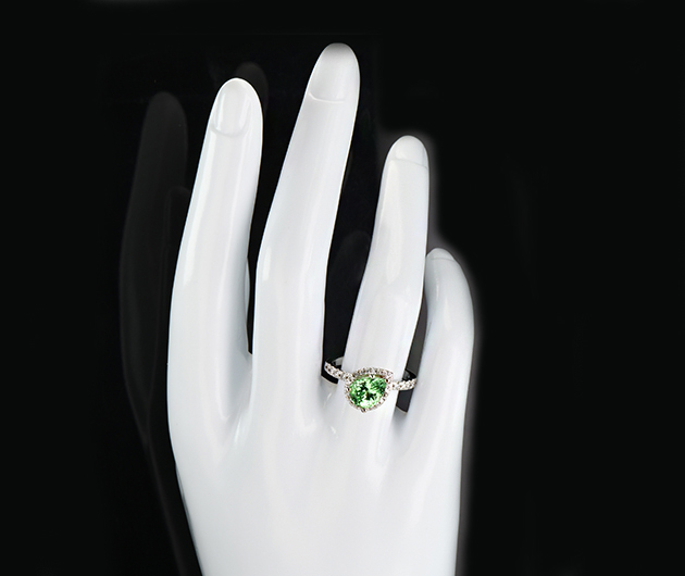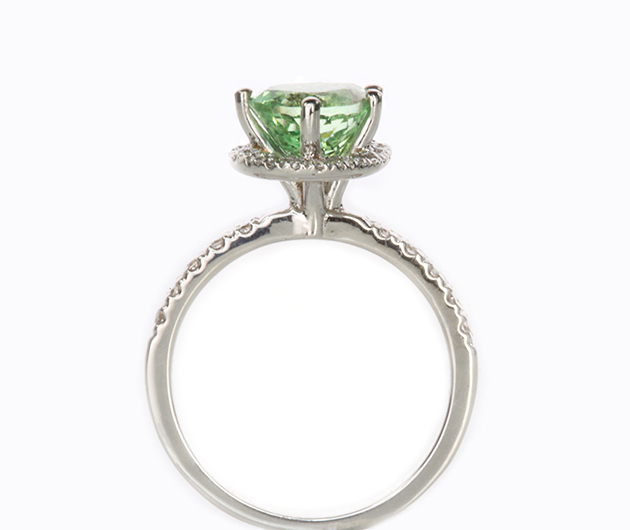 Center Stone: A fine, top grade Green Grossular - a striking, flawless, minty green with incredible brilliance and sparkle.