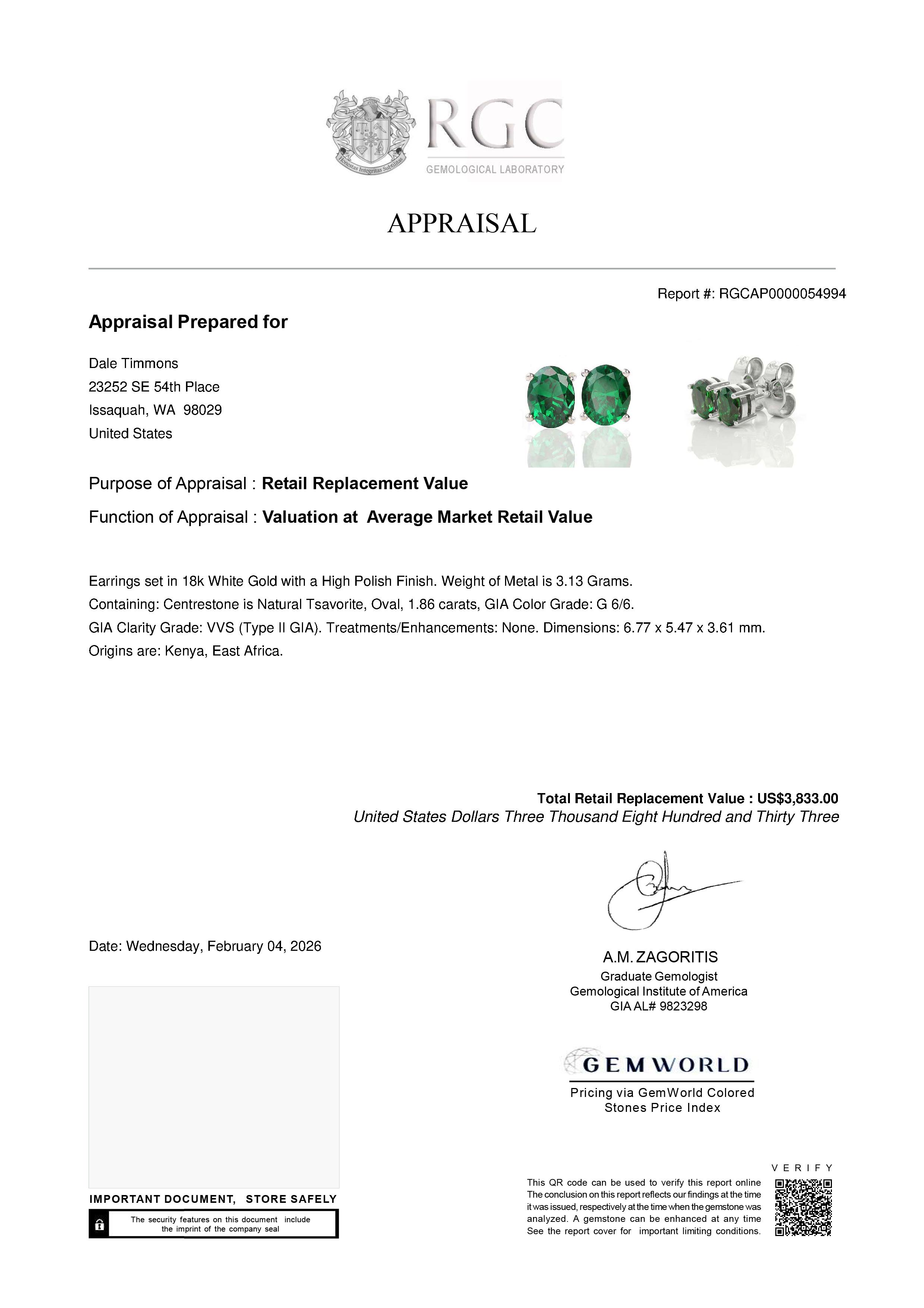 A. This appraisal has been prepared by a GIA Graduate Gemologist using specialist Appraisal Software.This software employs the following: