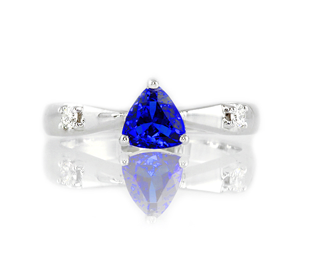 Center Stone: A classic Block D Tanzanite. This wonderful 0.73 carat trillion is cut on the blue axis – a superb sharp blue, deeply saturated color rarely seen in the market these days where the ubiquitous pale lavender colors predominate.
